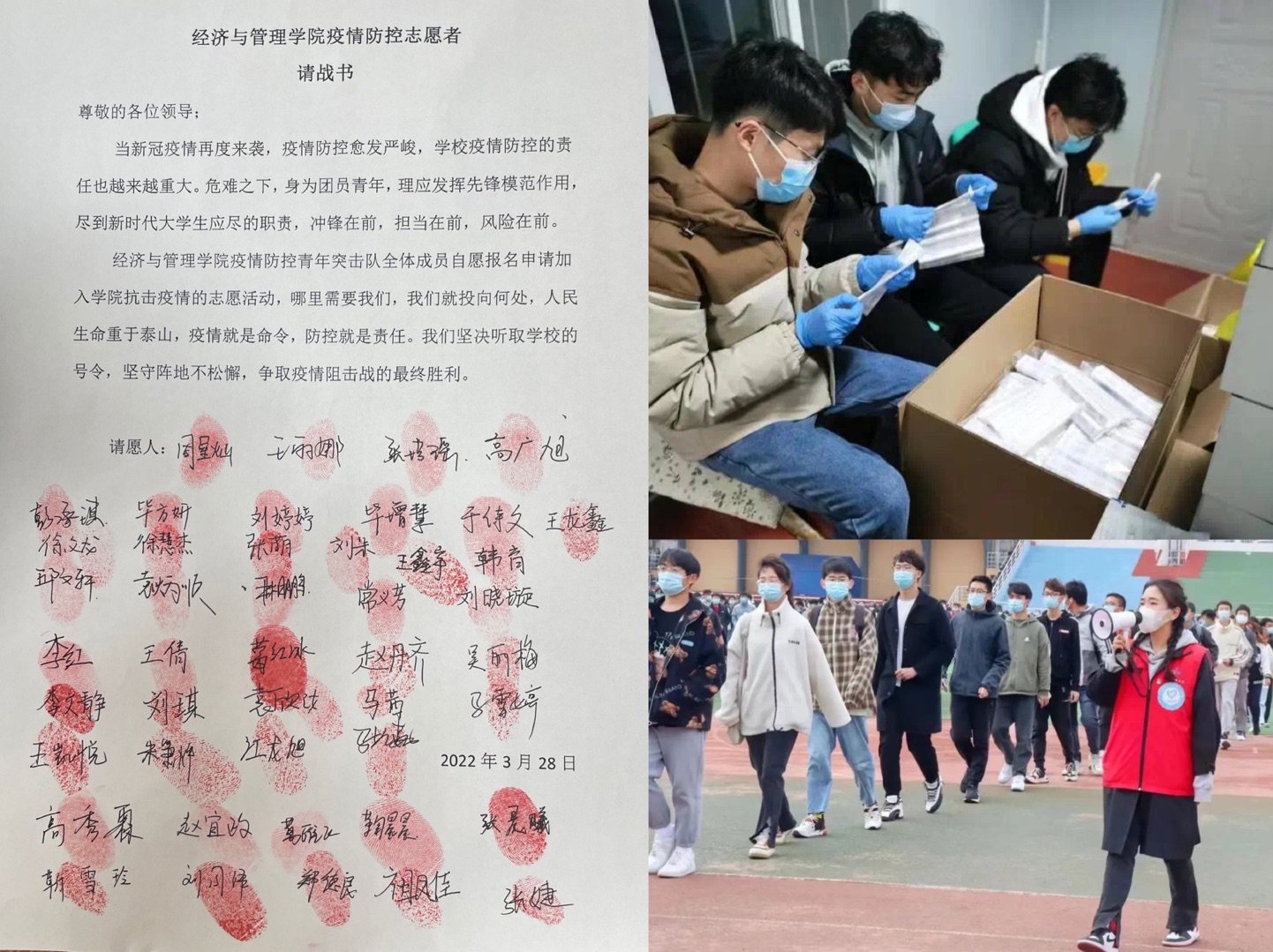 防疫措施的有序进行,离不开志愿者们的无私奉献,也是他们时刻提醒着我们:疫情防控人人有责。”不少师生也对志愿者们表达了真诚的感谢与真挚的敬意。经管学子们正以自身实践助力疫情防控志愿活动,他们用奉献彰显青春担当,汇聚涓流之力,共克时艰。他们坚守岗位,随时待命,承担起属于自己的那份责任,写下抗击疫情的青春诗行。他们以一道道青春身影,用责任与担当筑起抗击疫情的坚强堡垒,全力书写抗击疫情的青春答卷。