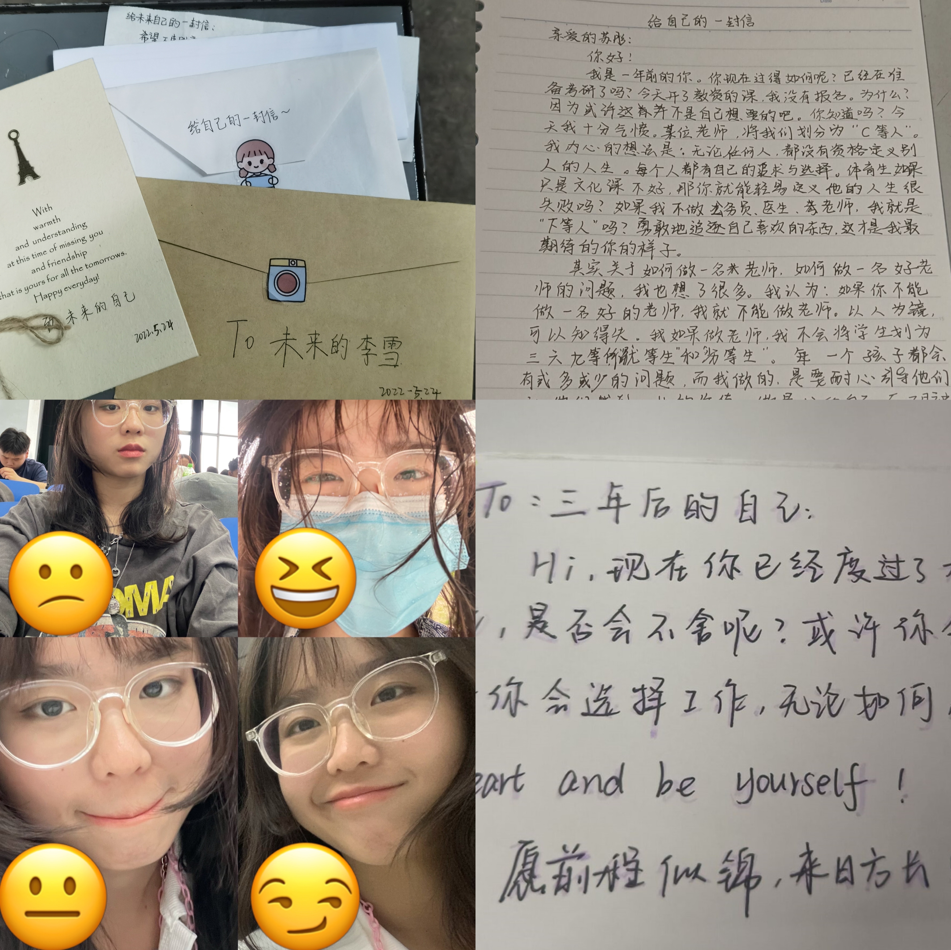 组织特色活动“今天的emoji”,通过让同学们把自己一整天的心情变成一张整体的照片拼图,帮助同学们更好地发现自己情绪的波动,学会调控情绪,做自己情绪的主人。“送向未来的信”,以文字的形式与将来的自己好好对话,跟过去好好道别,激励自己着眼于当下,憧憬着未来,借“我爱我”之名,提醒自己珍惜生命、关爱自己,学会了解、关爱和悦纳自我。