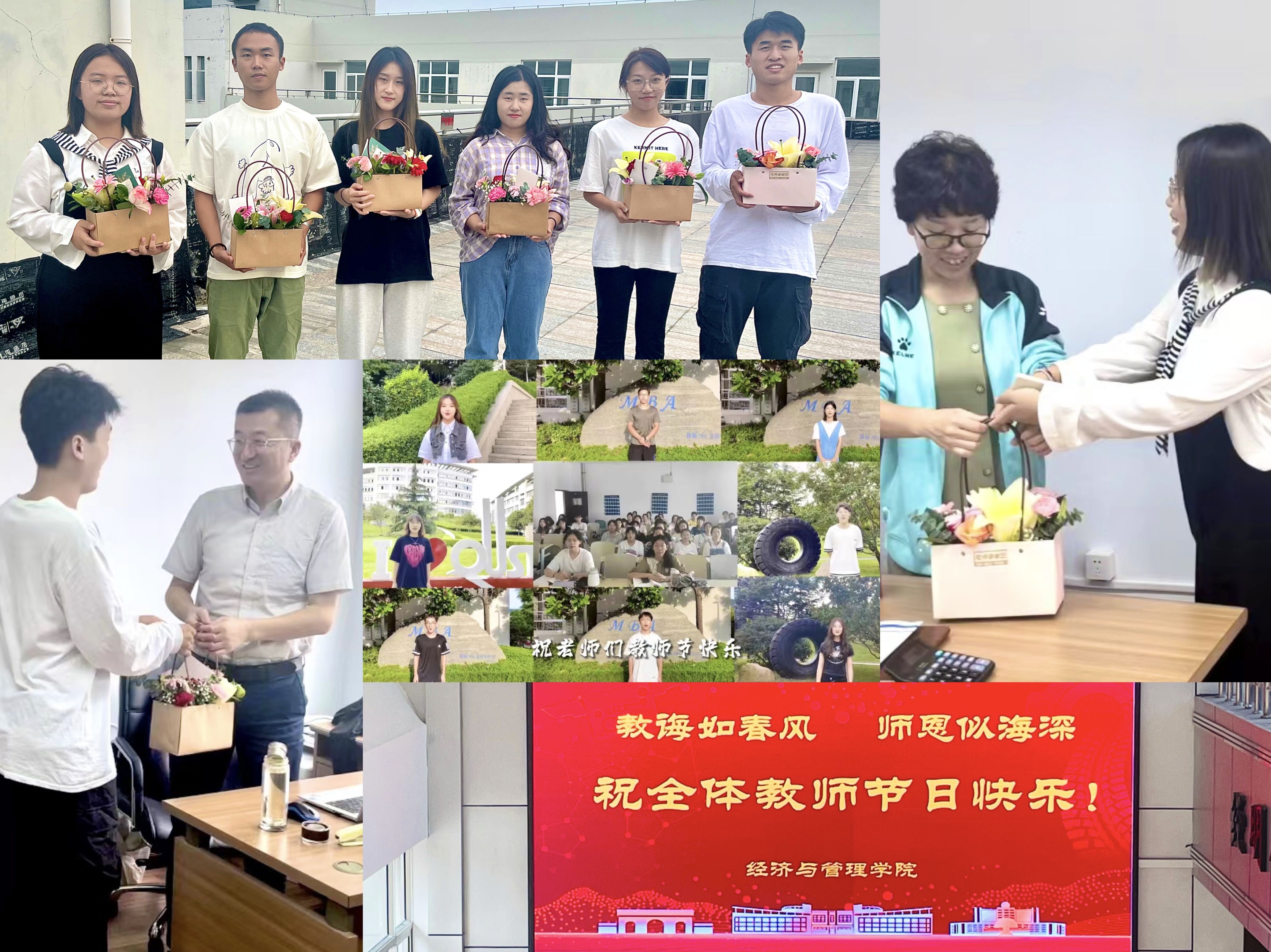 大厅、经管楼入口处等公共场所,利用LED屏、横幅、展板等多种形式为老师送上节日祝福,让教师的荣光在最高处闪耀。除此之外,学生会还组织“立德树人,致敬最美”教师节专题祝福视频拍摄活动,同时为老师献上鲜花、贺卡等节日礼物,向老师表达真诚的祝福和崇高的敬意。此次活动不仅培养了同学们尊师、爱师、感恩师长的情感和美德,进一步提升了教师的使命感和幸福感,更营造了师生同心、尊师重教的浓烈氛围。