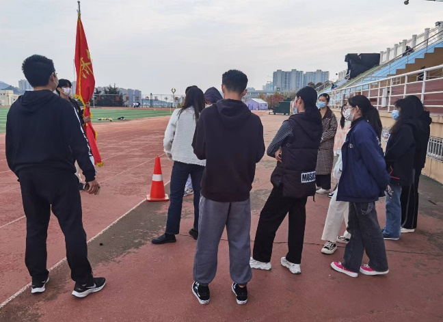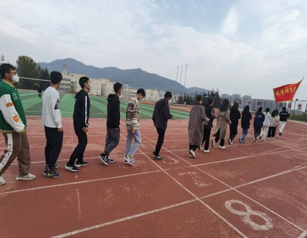 院旗,其他同学保持距离排成一排,活动全程5公里左右,参与人员全程佩戴口罩。在活动的过程中,同学们拿出手机拍照记录此项静默后自行开展的健康活动,号召更多同学参与其中。活动进行过程中,同学们共同合唱“我和我的祖国,一刻也不能分割。无论我走到哪里,都流出一首赞歌……”。大家个个精神饱满,昂首挺胸,以最佳的状态去展示自己的精神风貌。