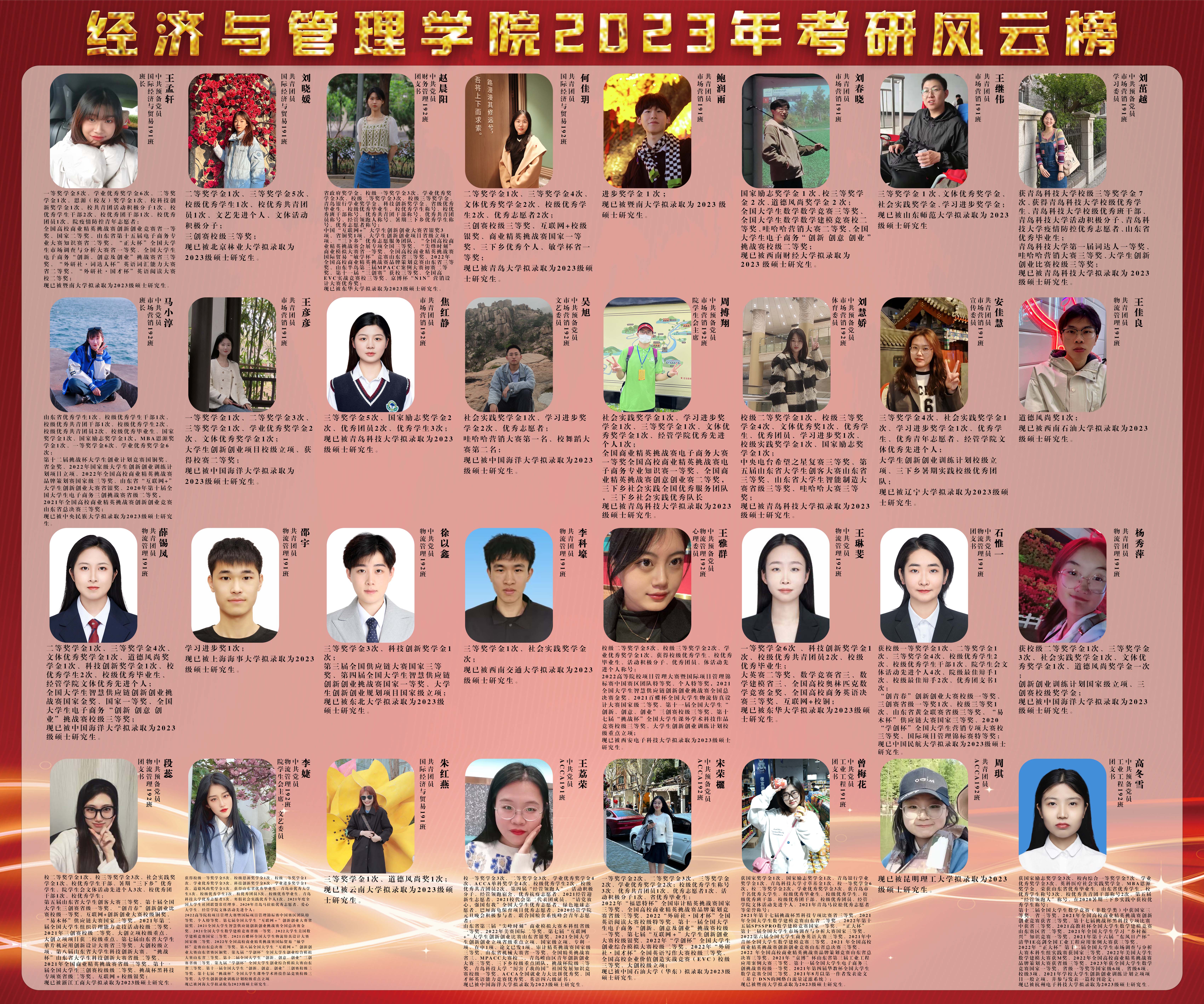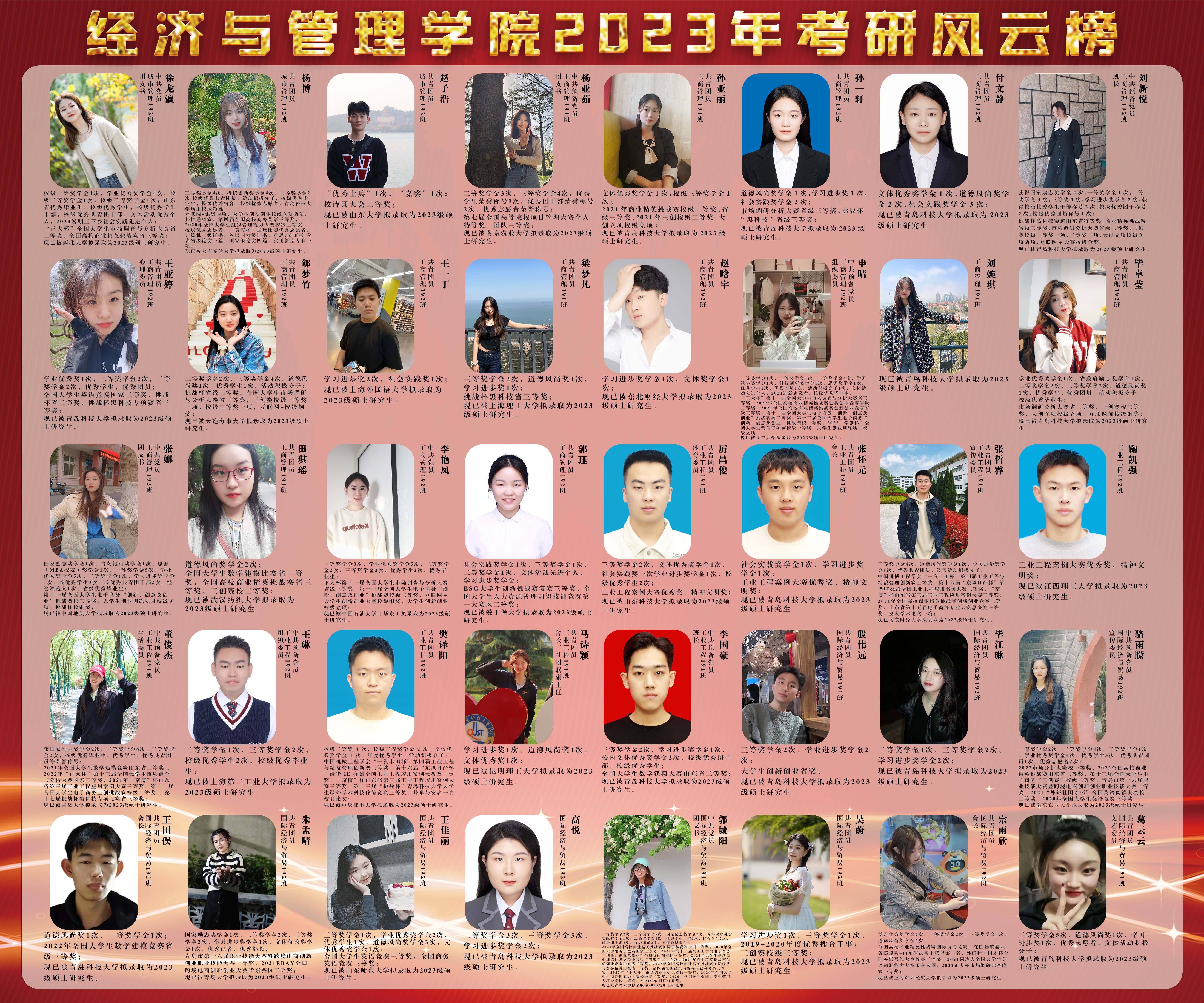 2023届毕业生共440名,其中119名学生收到了来自山东大学、中国海洋大学、河海大学等知名院校的录取通知,总体升学率达到27.05%,其中国内考研率达25.45%,实现新突破!