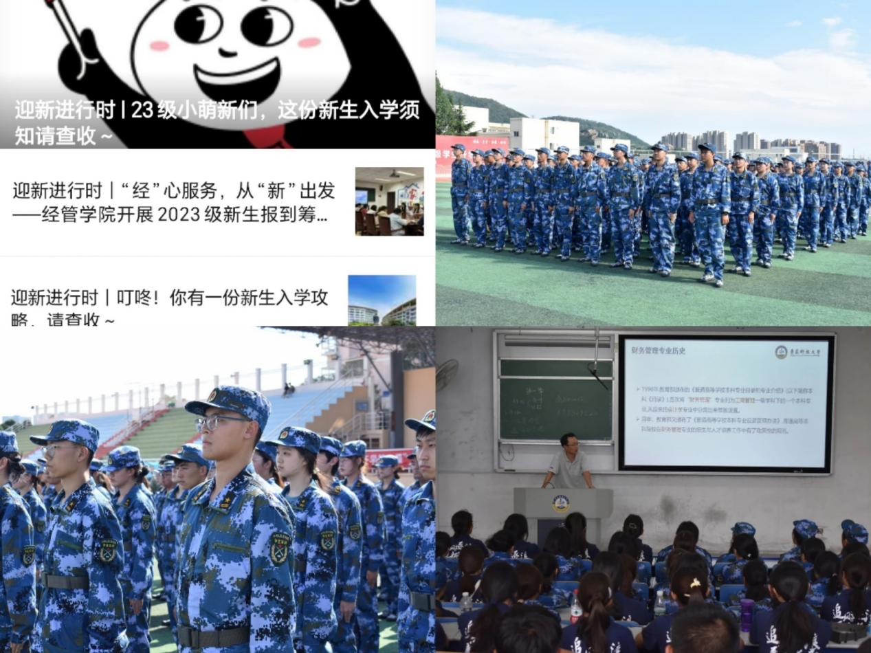 和专业介绍、安全知识科普等内容,帮助新生提前融入大学环境新氛围;新生入学后第一时间开展军训,培养经管学子艰苦奋斗、吃苦耐劳的精神品质;开展各专业见面会,帮助新生强化专业认知与未来规划意识,上好新生第一堂“思政课”;组织各专业破冰活动,促进新生之间的相互交流并培养团队协作能力。