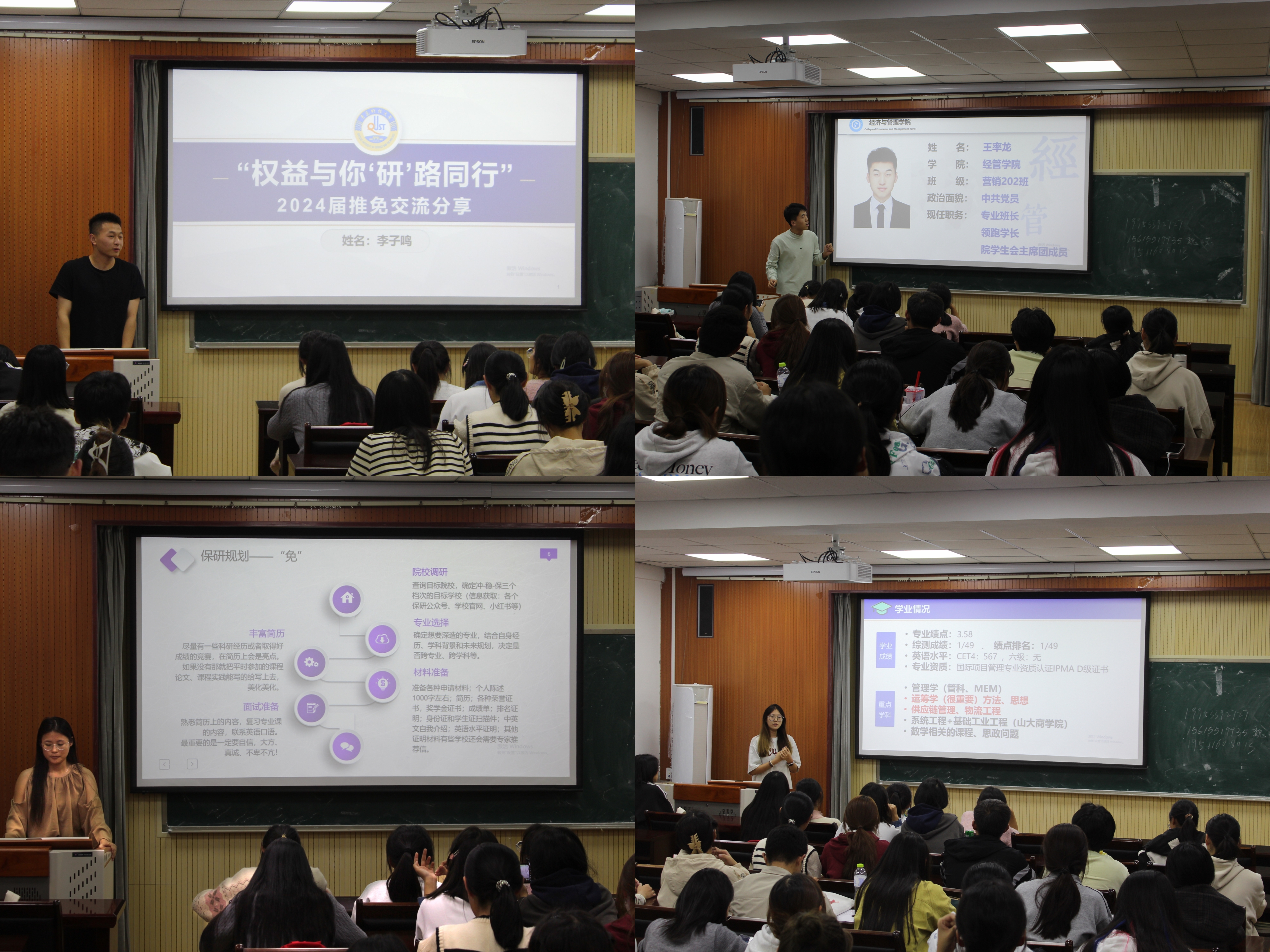 工业工程专业的李雨洪强调了考前复习的必要性,为同学们展示了保研时间轴,将保研规划分为推、免两方面,说明面试准备的“三部曲”。物流管理专业的王莹在会上表示要坚持学习过程,不轻言放弃,不断丰富校园组织经验和实践志愿经历。同时王莹为大家展示了推免路程和获取信息的渠道,点明努力与信息差的重要性,鼓舞同学们保持坚持不懈的步伐继续前进。