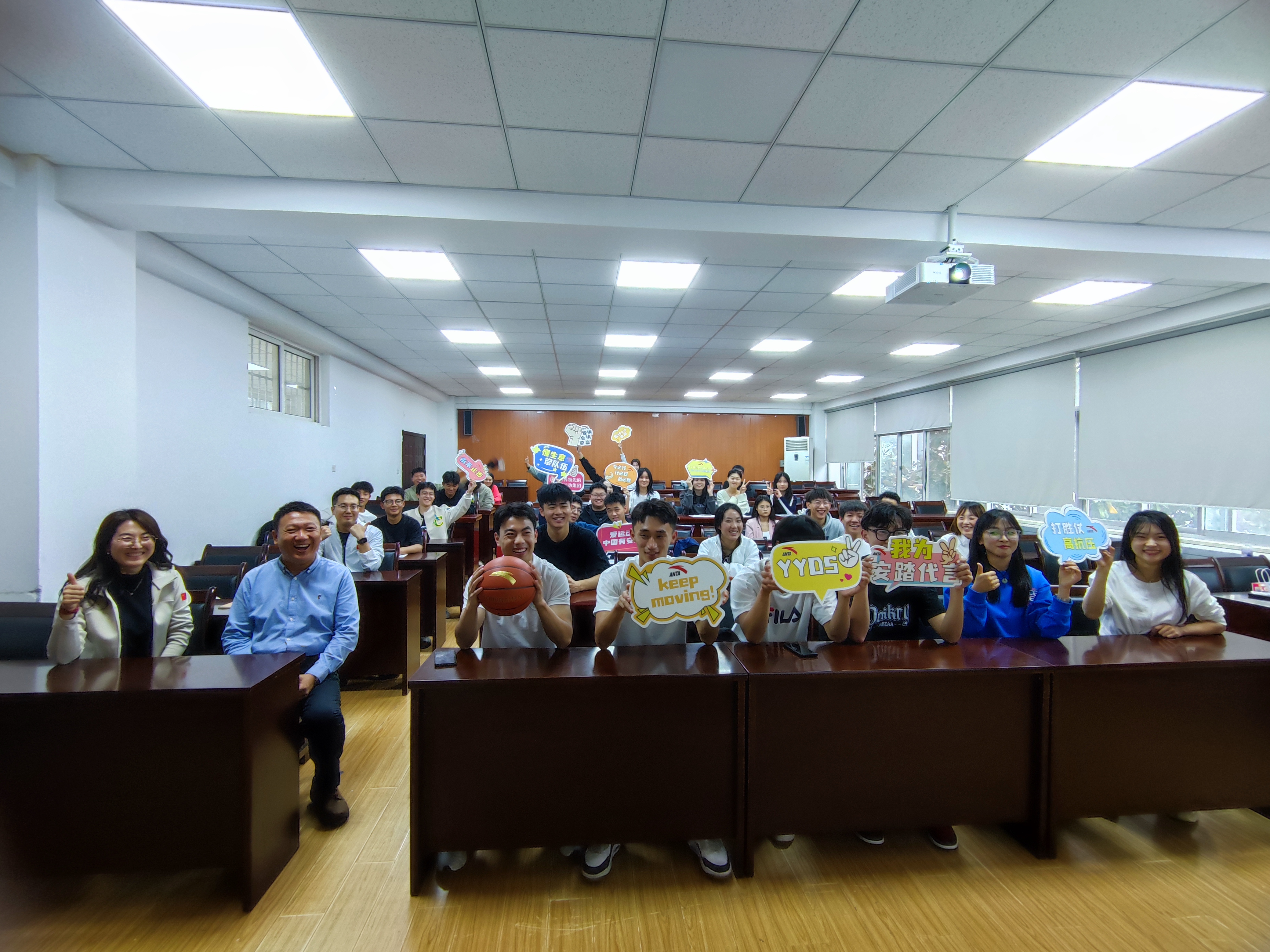 宣讲会现场气氛活跃,人力资源部经理通过视频宣传、PPT展示、提问送礼环节,以及面对面交流的方式,详细介绍了安踏的招聘岗位、培育发展成果、管培生兴趣培训班、薪资待遇、员工福利等,让同学们更加深入地了解安踏。
