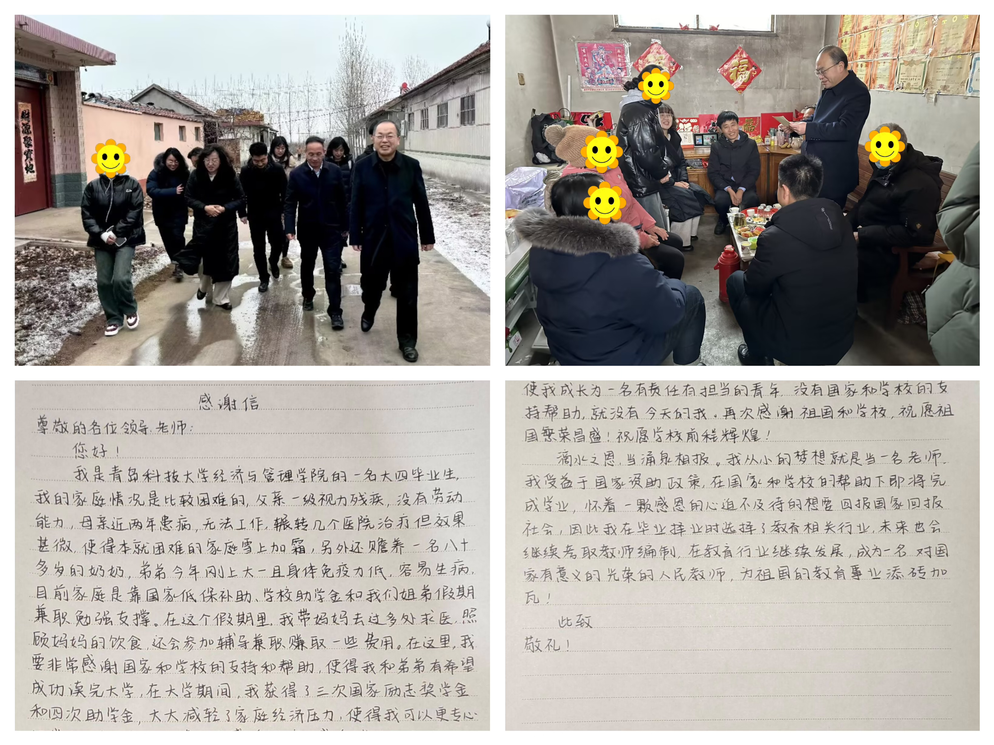 党委书记李勋来、党委副书记牛宝卫带队,全体辅导员深入学生家庭居住地,全面了解和掌握特殊群体学生及其家庭的生活情况,深入开展资助政策宣传,并为学生送去助学金和新年礼包。同时,对家长和学生普遍关注的资助政策、考研趋势、就业前景等问题进行了悉心的解答与分享,鼓励学生克服困难、奋发图强,用实际行动感恩父母、回报社会。