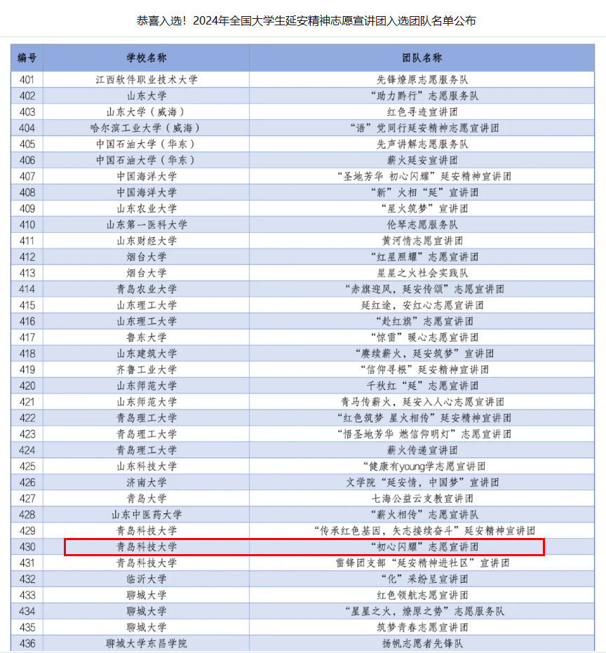 共有3支团队成功入选。其中,“逐梦星火”志愿宣讲团入选2024年全国大学生井冈山精神志愿宣讲团(队长:张妙可),“初心闪耀”志愿宣讲团入选2024年全国大学生延安精神志愿宣讲团(队长:林昊),“燎原星火 山海相传”两弹一星精神宣讲团入选2024年全国大学生“两弹一星”精神志愿宣讲团(队长:马庆宇)。