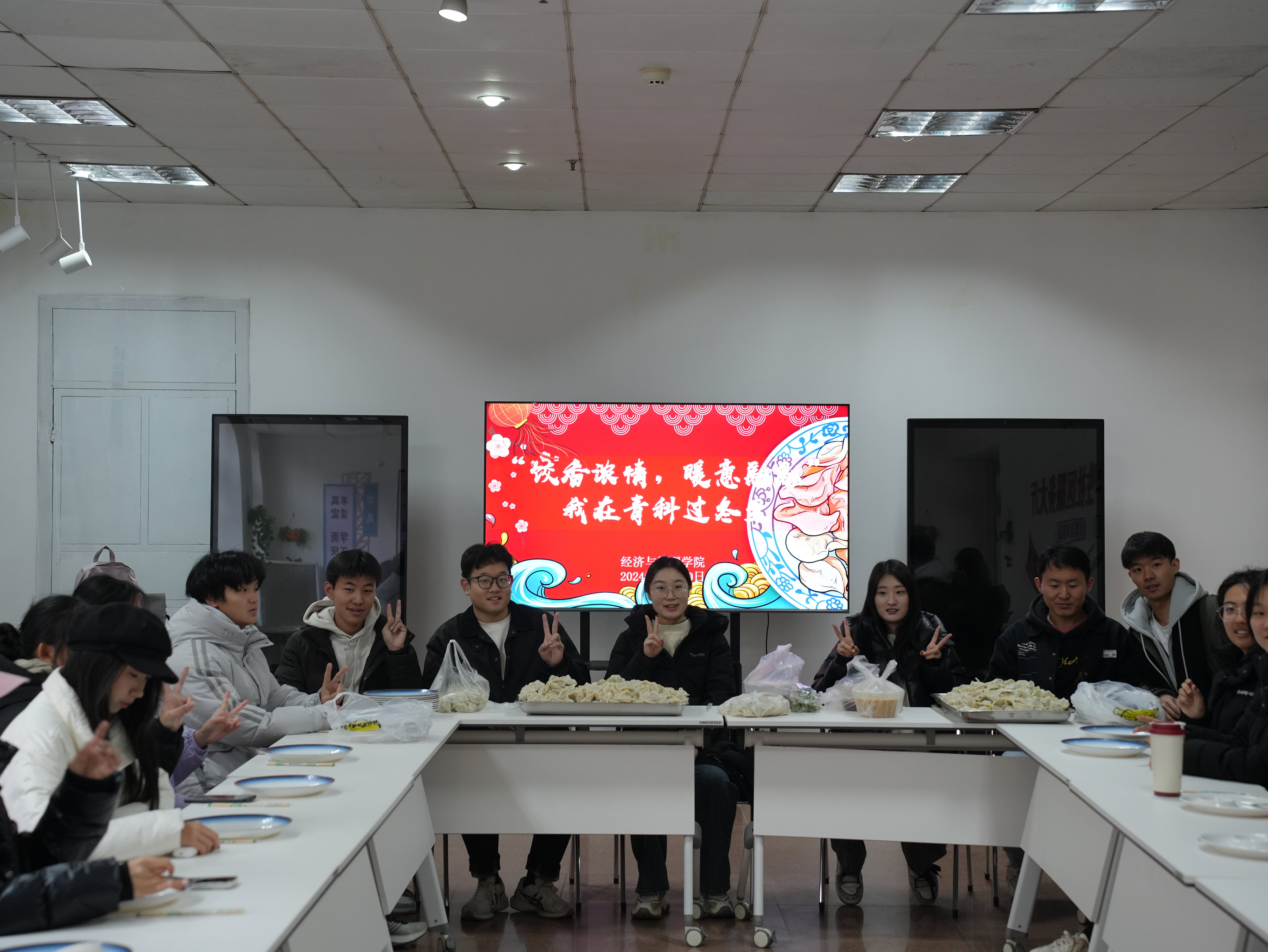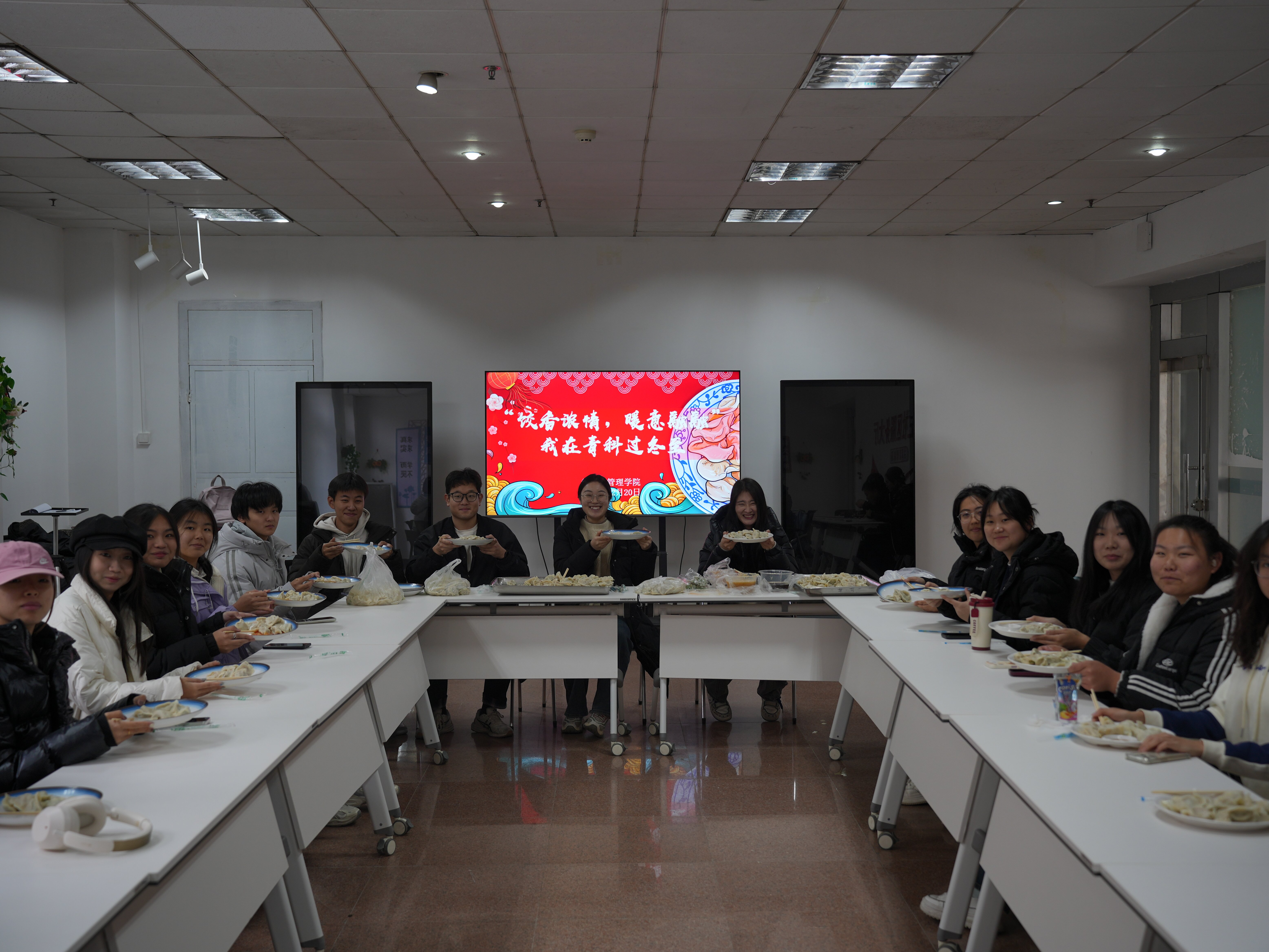 在朋辈力量和领跑学长的带领下,同学们围桌而坐,一起分享饺子,畅谈近期的学习生活与未来规划。学长学姐们暖心的问候让同学们倍感亲切,冬至虽寒,同学情暖。