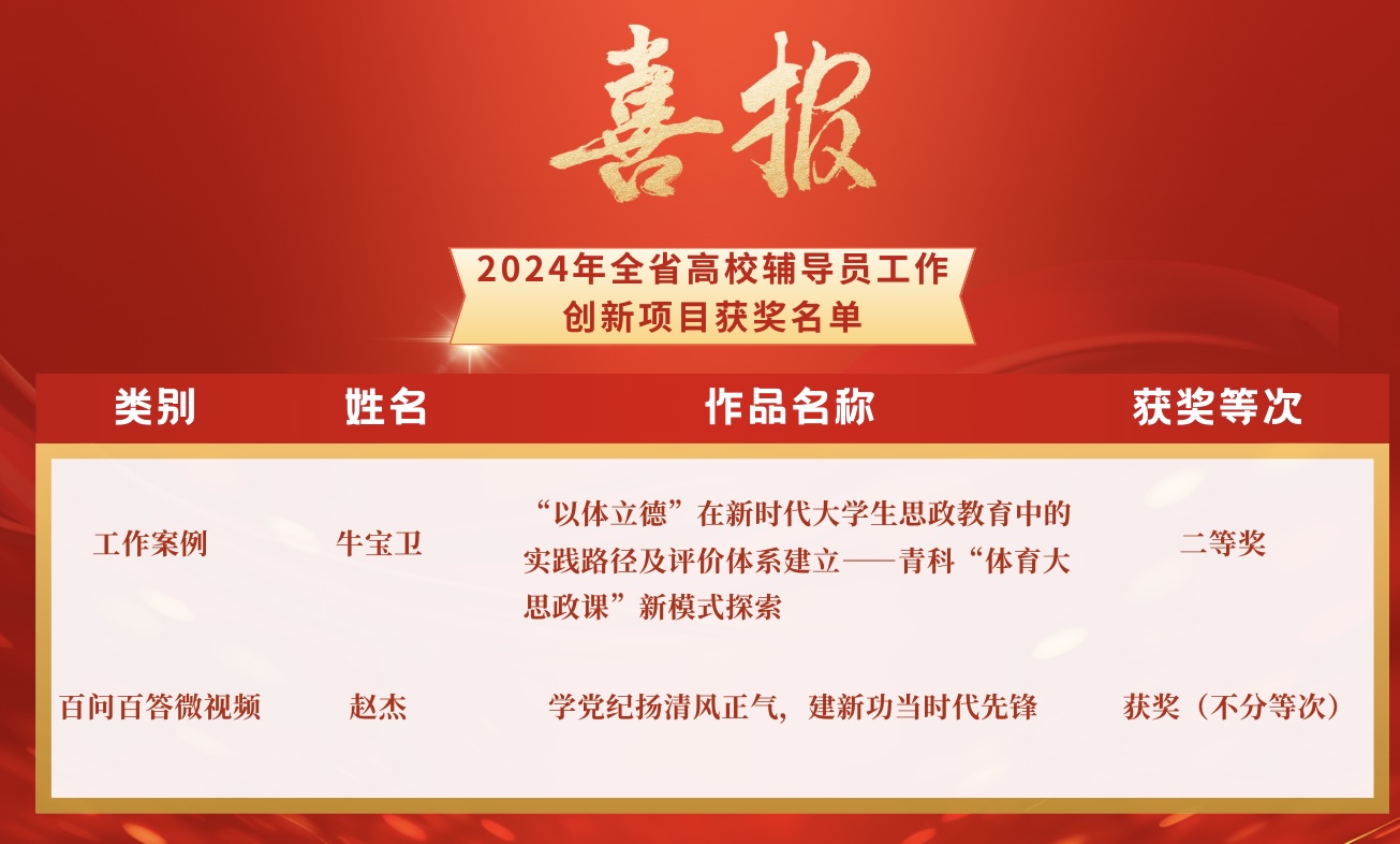 报送的工作案例《“以体立德”在新时代大学生思政教育中的实践路径及评价体系建立——青科“体育大思政课”新模式探索》(作者:牛宝卫)获评二等奖,报送的微视频《学党纪扬清风正气 建新功当时代先锋》(主讲人:赵杰)获评优秀百问百答微视频。