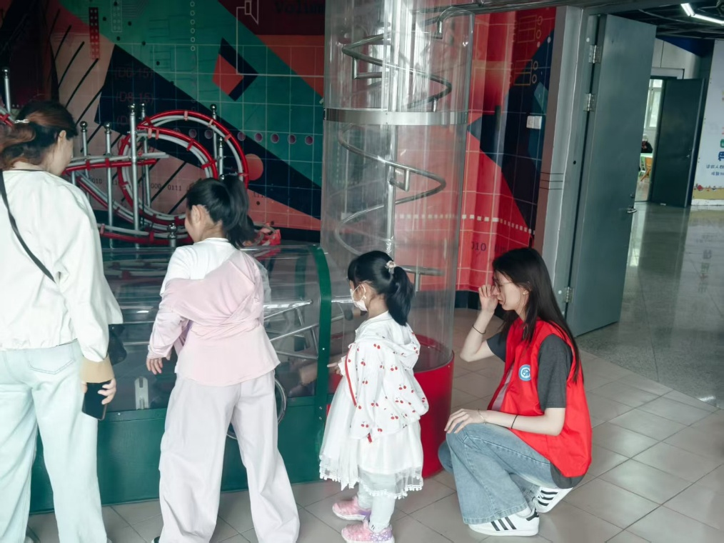 在科技馆机械探秘区,暖心愿志愿者与小朋友积极互动,引导孩子通过自主调节滑轮间距、更换轴承材质等方式,直观感知摩擦力对运动速度的影响;在动势能转化装置前,小球滚落带动齿轮传动点亮灯组、摆锤摆动敲响铃铛的奇妙现象,引发了孩子们对能量转换原理的深入探索,有效培养了青少年的科学思维和实践能力。