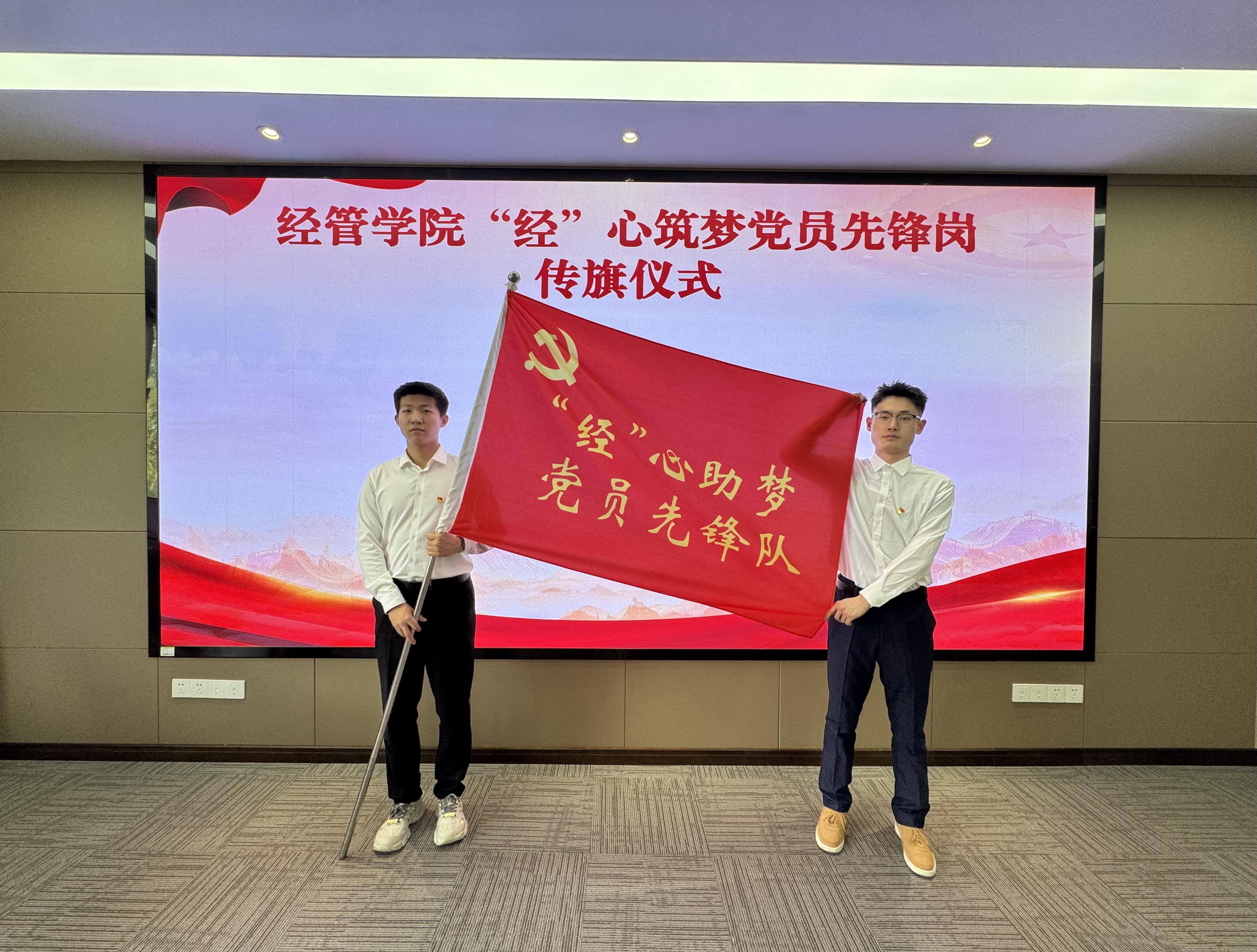 毕业生党员代表郭梦瑶、刘伊宁、刘雪祯、朱云云分别分享了自己的毕业去向,深情表达了对母校的感恩之情。在校生党员代表林昊讲述了自己在党员先锋“七个一”工程引导下,与同学互帮互助、共同成长的故事,并向毕业生党员送上离别祝福。随后,在与会党员的共同见证下,毕业生党员李子超将“经”心筑梦党员先锋岗旗帜传递给在校生党员林昊。