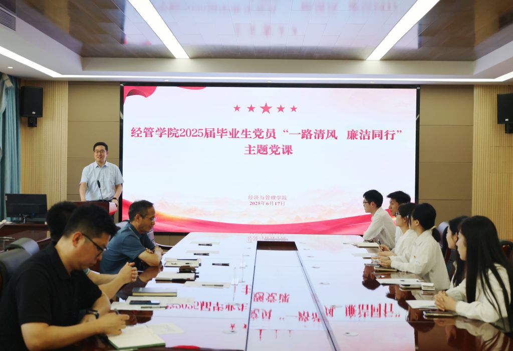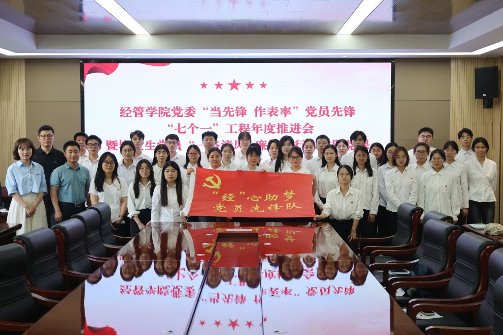 党委“当先锋 作表率”党员先锋“七个一”工程的进展成效。他提到,“七个一”工程内容丰富,其所涵盖的党团联动、结对帮扶、志愿服务、选树典型、红色活动等内容对于激励党员在学习、科研、实践中主动亮身份作表率、增强党性修养发挥了巨大作用,自2024年6月启动以来,建设成效显著,形成了具有经管特色的党员教育管理新范式。他强调,这不仅仅是旗帜的交接,更代表着责任与担当的传承,象征着一代代经管党员先锋接力传递的使命,先锋的接力棒将始终在传承中焕发新的光芒。