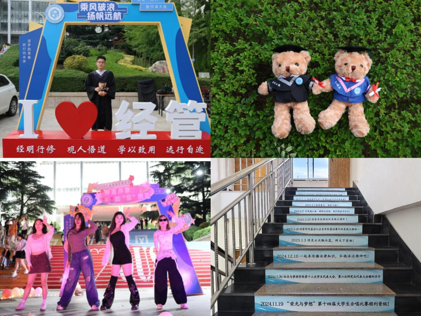 精心设计的毕业纪念小熊,身着专属学士服,成为承载青春记忆的独特信物,为毕业生定格难忘瞬间;“青春印记”纪念楼梯贴以校园点滴与毕业寄语,在台阶间铺展代际相连的情感长廊。这些浸润着美育温度的创意表达与暖心设计,将青春故事凝刻成永不褪色的纪念。