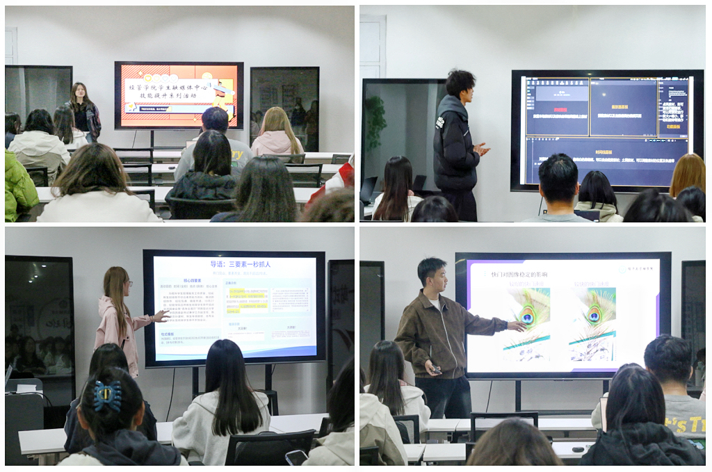 学生融媒体中心骨干赵紫涵、李泽毅分别聚焦视频剪辑、文稿撰写、场景拍摄三大核心技能,开展专题分享。杜裕禄从校园活动视频的叙事逻辑构建与亮点内容提炼入手,层层拆解实操技巧,为视频素材处理提供专业指导;赵紫涵以校园宣传稿的底层逻辑为切入点,系统解析官方文稿的标准格式、语言规范与易错要点,指导同学们搭建清晰严谨的文稿结构、打磨精准生动的表达,夯实文案撰写核心硬实力;李泽毅针对校园各类活动场景,讲解针对性拍摄方法与实用技巧,引导同学们精准把握拍摄核心要点,提升宣传素材的内容表现力。
