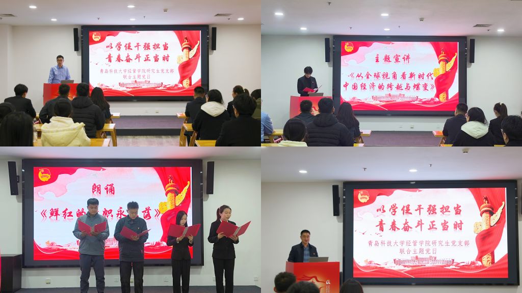 张皓越同志作为2024级首位发表C刊的研究生,以“从全球视角看新时代中国经济的跨越与蝶变”为题,带来了一场别开生面的党的二十届四中全会经济学视角分析。他结合详实数据与生动案例,阐述了新时代以来中国经济从要素驱动向“创新驱动”转变、从“高速增长”向“高质量发展”跃升的伟大实践。在朗诵环节,肖洋等同志铿锵有力的诵读声带领与会同志回顾了1935年的“一二・九”运动,爱国青年学子为民族危亡挺身而出的热血历程,字里行间饱含着对革命先辈的敬仰之情,更彰显着新时代青年传承红色基因、勇担强国使命的坚定决心。当诵读到“在中国,只要有青年,就有希望!”时,现场党员无不心潮澎湃、热血沸腾。