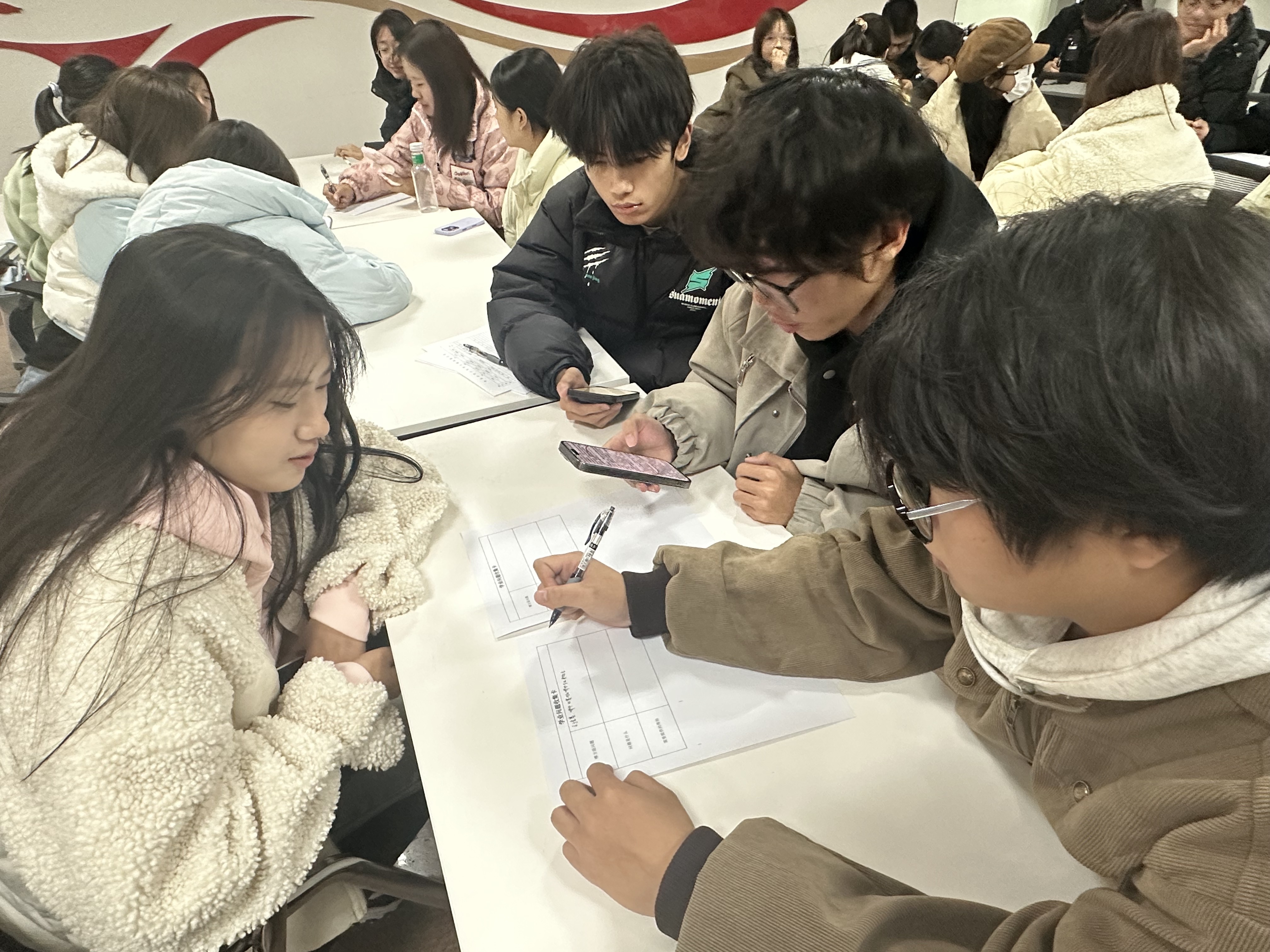 随后,团支部围绕“诚信备考”展开学业指导。学习委员结合宏观经济学等专业科目的期末考核重点,梳理知识点框架,分享“错题归类+真题演练”的复习方法,针对财务分录、成本核算等难点内容,建议团员组建线上复习群,实时交流问题、共享学习资料。多名团员结合自身复习进度,提出“每日打卡背记财经法规”“小组轮流讲解知识点”等备考建议,现场形成多项实用的复习举措,为期末高效备考提供思路。