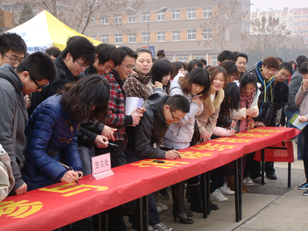 师生积极参与到此次活动中来。随后刘居庆局长介绍了四方区历年来的结核病预防与防治工作,并动员在场师生积极进行结核病防治知识及政策的宣传。讲话完毕,各位领导便在主题横幅上签字。随后现场观众亦踊跃参加现场的签名活动。最后,启动仪式进入互动环节,志愿者报名、现场知识竞答、现场咨询,同学们纷纷积极参加,场面十分热烈。