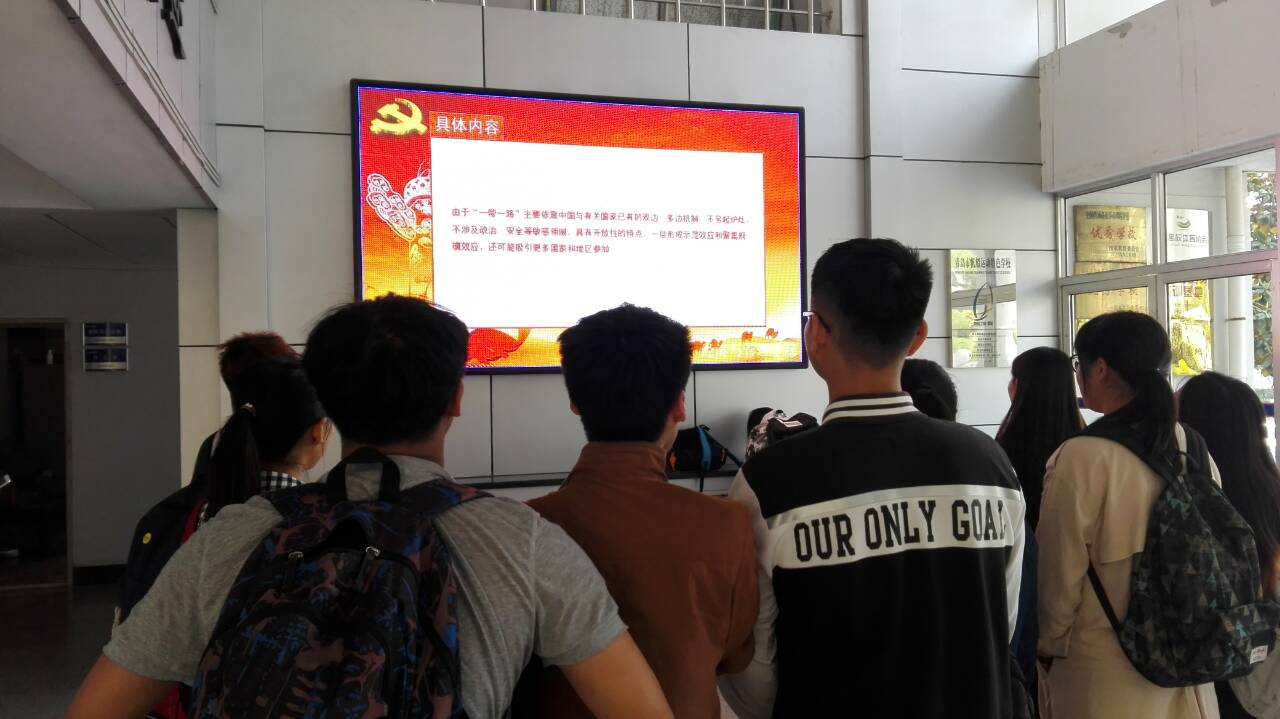 辅导员组织学生实时观看“一带一路”国际合作高峰论坛开幕式,分年级开展“一带一路”形势政策课教育,组织班级举行主题班会,成立学习小组,引导学生正确理解党和国家的路线、方针、政策,增强时代使命感。