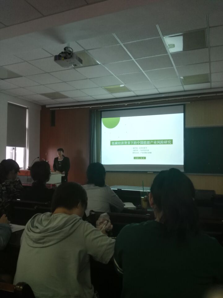 新聘任的博士陈明老师与大家分享了自己的博士论文《低碳经济背景下的中国能源产业风险研究》,她详细介绍了能源产业的发展现状,并在研究中运用了多种方法对低碳经济背景下我国的能源产业风险进行了识别、测量、评价和预警,引起了同学们对能源产业的强烈关注。