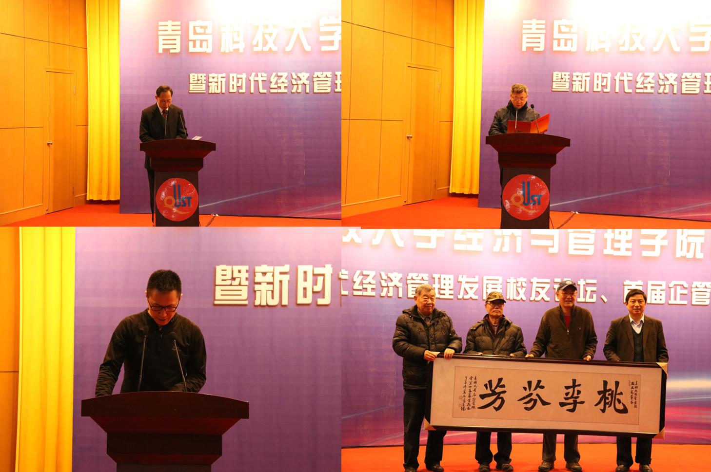 --“圆”基金启动仪式。青岛软控股份有限公司副董事长、97级工商管理鲁丽娜校友代表袁仲雪董事长,青岛西岭商务有限公司王同谦校友代表傅相俭董事长,10级MBA学员代表宫平强,93级工业外贸校友温炳亮董事向校友基金进行了首批捐赠。