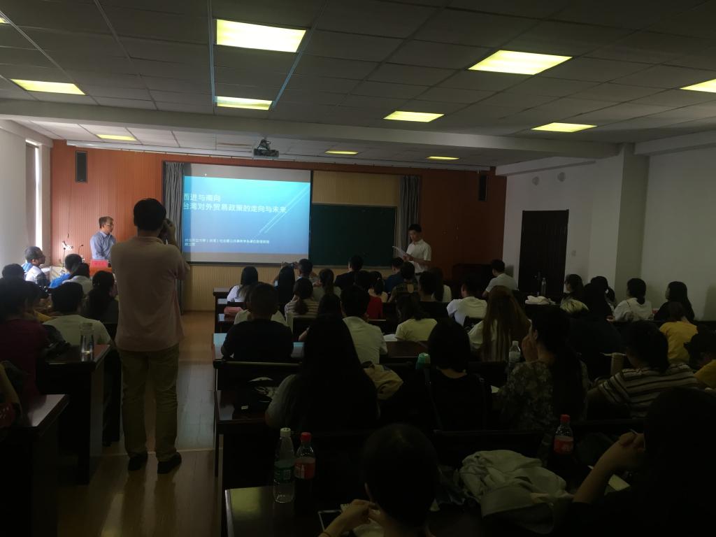 对顾教授到来表示热烈的欢迎!顾教授为大家做了题为《西进与南向—台湾对外贸易政策的走向与未来》的精彩报告。其主要内容包括五部分:台湾对外贸易的特质与发展过程;台湾与大陆的贸易现状;台湾与东南亚地区的贸易现状;蔡英文新南向贸易政策现状与困境;两岸的合作互利。顾教授认为,台湾新南向政策的实施将面临很大的困境,台湾未来的出路是:加强和大陆合作,实现合作共赢。