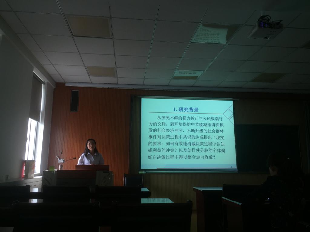 论坛开始,和媛媛老师做自我介绍并与大家分享了其获得立项的国家自然科学青年基金项目,项目主题为《多样异质数据环境下群体共识规则及反馈机制研究》。在报告中,她详细介绍了异质多属性群体共识模型、异质多属性大群体决策反馈机制及共识模型、异质多属性群体共识模型的仿真实验研究、异质多属性群体共识模型应用研究这四大部分内容,引起了老师和同学们对反馈机制研究的强烈兴趣。