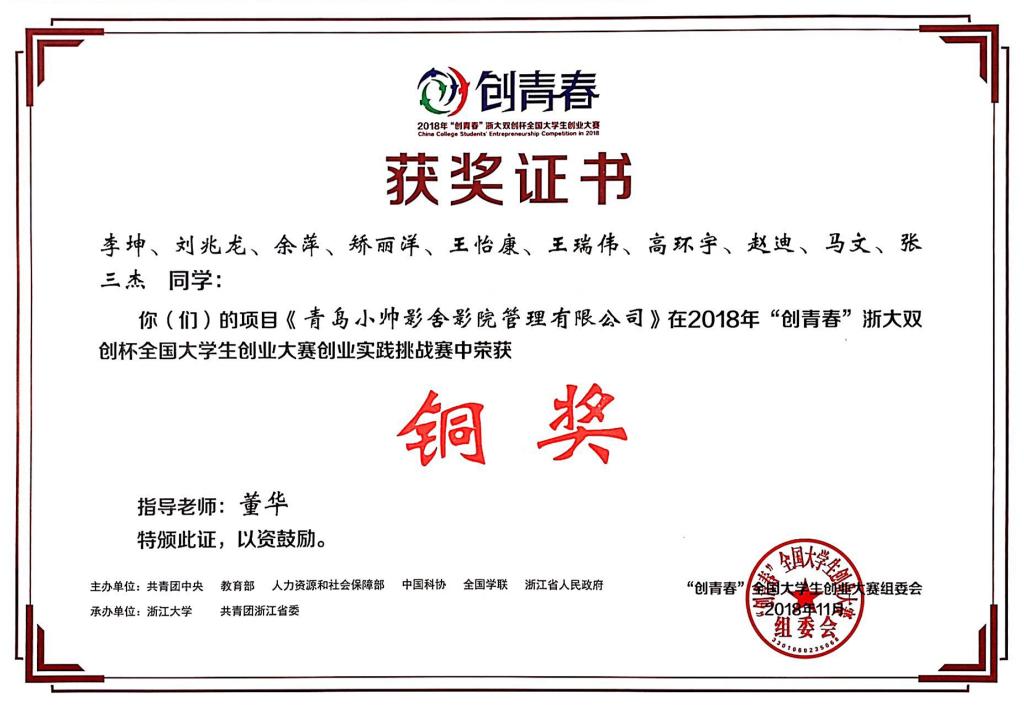 推送的作品《青岛小帅影舍影院管理有限公司》获得创业实践挑战赛铜奖。本次大赛由共青团中央、教育部、人力资源社会保障部、中国科协、全国学联、浙江省人民政府主办,浙江大学、共青团浙江省委承办。