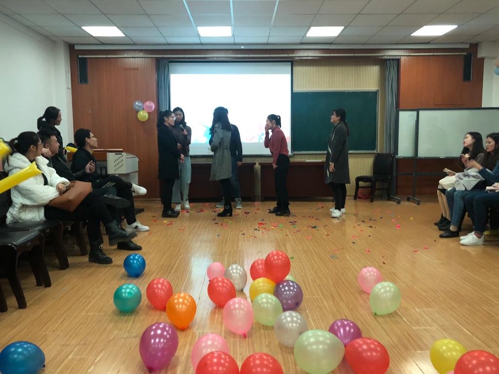 活动共设置趣味游戏、节目串烧和现场抽奖三个环节。在主持人幽默风趣的引导下,开始暖场环节——击鼓传球,迅速点燃了现场的气氛,充分调动全场嘉宾的积极性。此次活动还设计了“爆炸吧!气球!”、“成语猜猜猜”、“财务管理”三个加强交流互动的游戏环节,同学们踊跃参与游戏,现场气氛轻松、愉快。在游戏的中间休息环节,由18级学硕、专硕研究生献唱《追光者》、《简单爱》、《魔鬼中的天使》,并穿插了抽奖环节。现场气氛热烈,观众中不时传来阵阵欢声笑语。