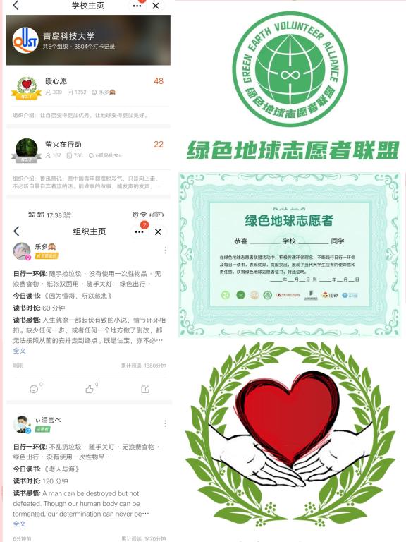 暖心愿爱心公益团队于3月12日植树节,组织开展“绿色地球”线上志愿活动,鼓励大家进行每日读书打卡,交流学习心得,并积极传递环保理念,每天分享生活中的环保小方法。随着活动的推广,其他社团也纷纷响应号召,活动期间,暖心愿共召集三百多位成员,累计两千条读书心得及日行一环保打卡记录,展现了当代青年学生应有的使命感、责任感。