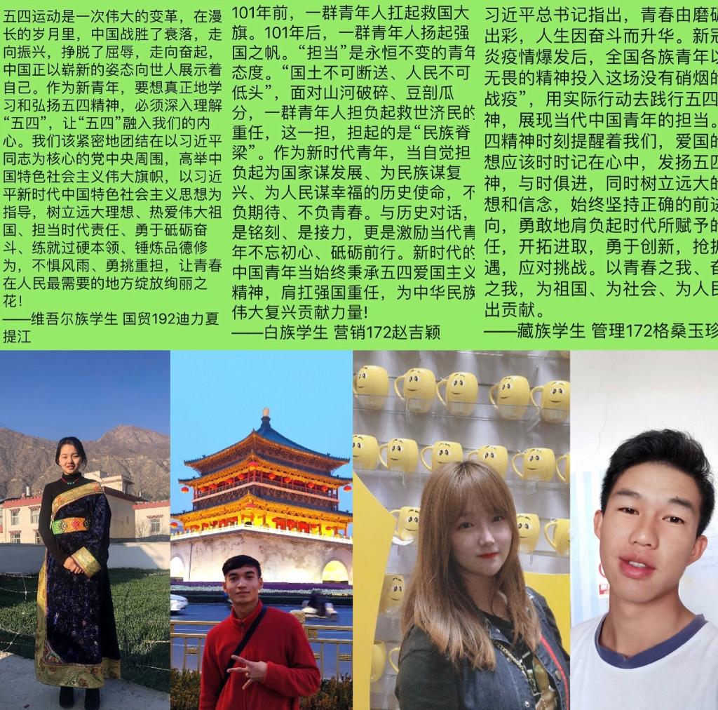 开展了“各族共筑中国梦,爱国精神永流传”少数民族“青年说”活动,带领少数民族学生回顾疫情期间涌现出的90后“最美逆行者”感人事迹,通过视频会议“云分享”学习感悟,共同上好这堂青春大课、信仰大课。市场营销162班维吾尔族学生热依汗感慨发言:“青年一代有理想、有本领、有担当,国家就有前途,民族就有希望。1919年,青年为国奋起,奔走街头;2020年,青年秉承先志,一线抗疫。危难关头,‘我上’是青年的誓言,‘不退’是青春的姿态!”