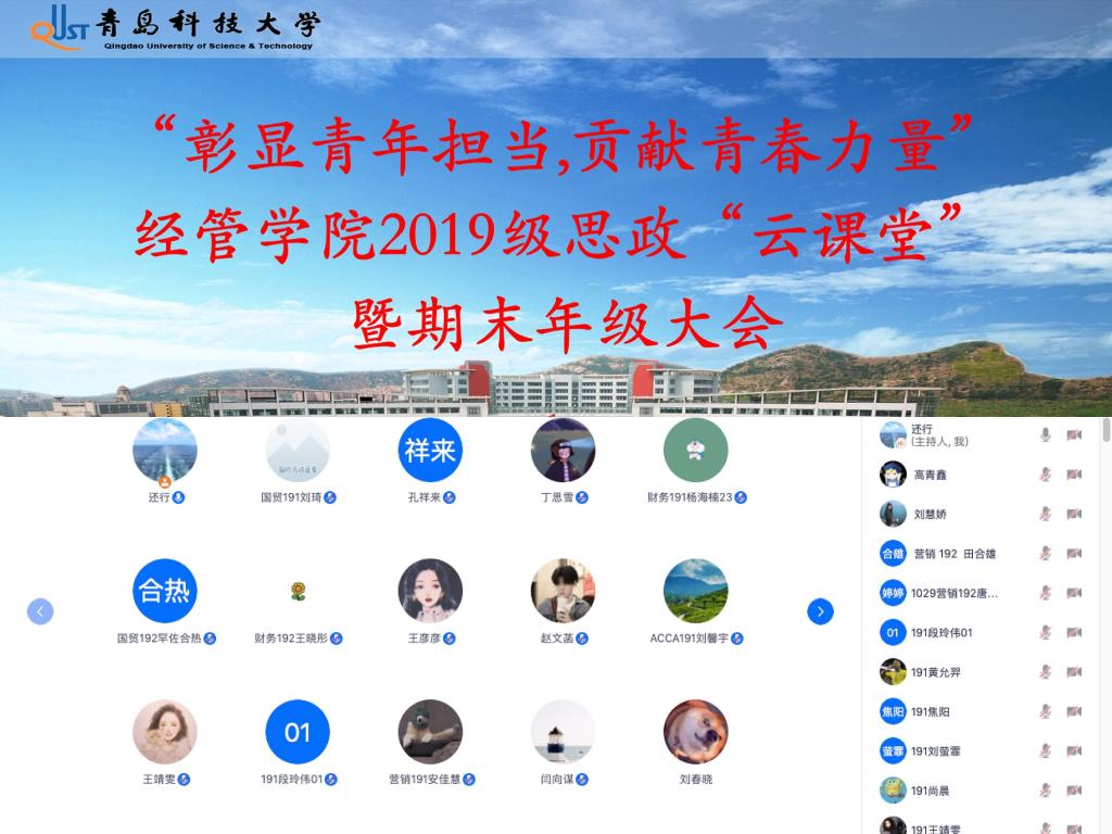 2019级分专业召开“彰显青年担当,贡献青春力量”思政“云”课堂暨期末年级大会。会议通过腾讯会议平台召开,由19级辅导员孙一君、初桂民、于潇华主持,19级全体学生参加。
