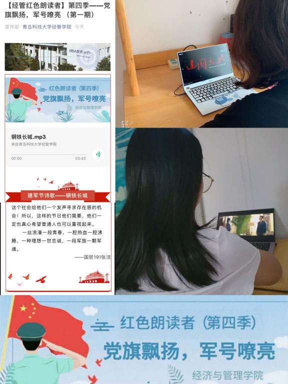 创新学生党支部特色活动“红色朗读者”展示形式,融入新时代强军主题,推出“党旗飘扬,军号嘹亮”第四季朗读系列及“军旗扬,军歌响”歌曲传唱活动,同学们感情真挚、字字铿锵,用作品诠释了爱国爱党爱军精神。通过官网、官微、易班等渠道开展的“同庆建军节,共叙鱼水情”活动中共收到画作、寄语、海报等优秀作品百余份,形式多样,富有创意,正面引导青年学子传承和发扬中国军人精神。