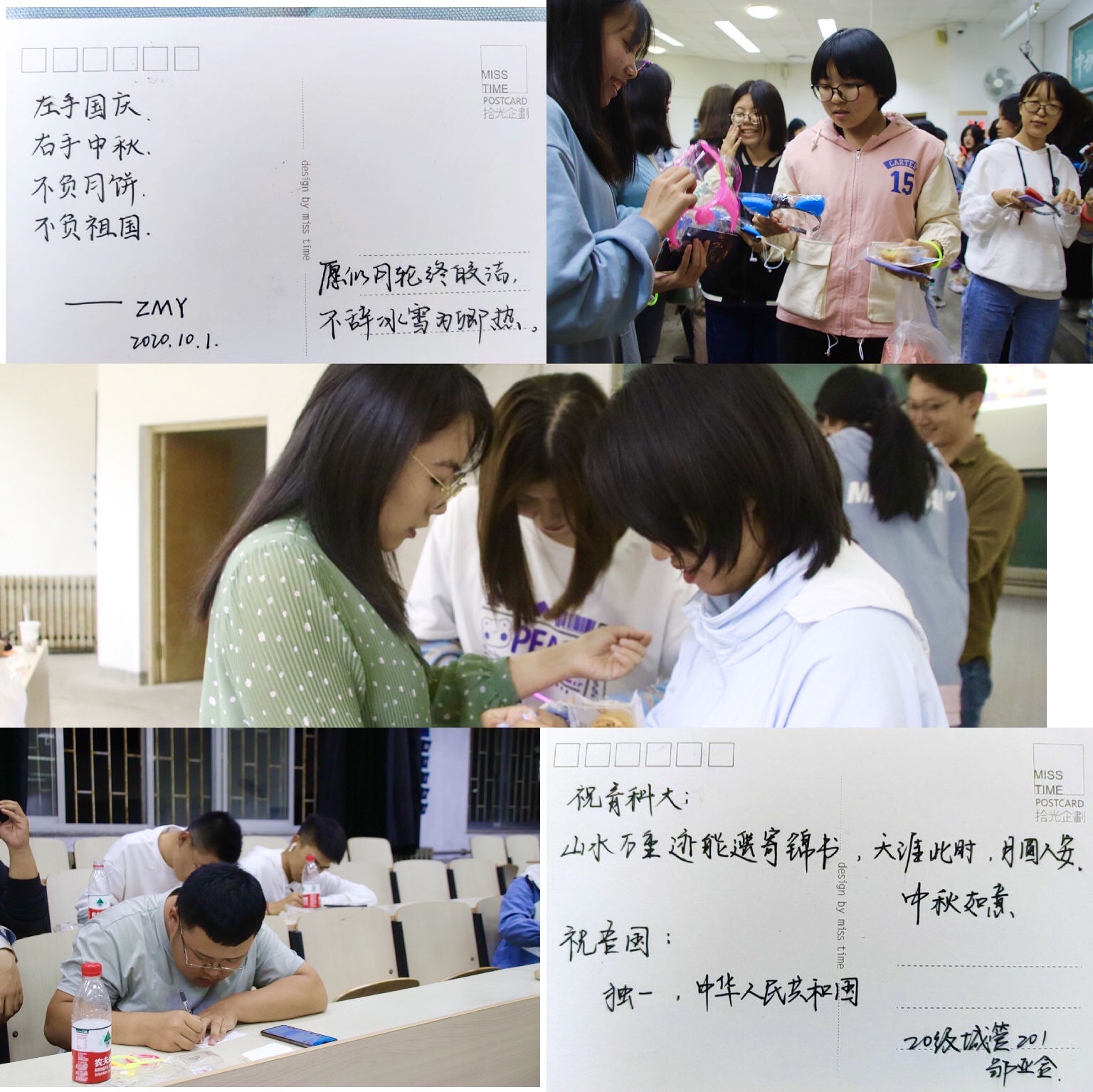 以“随风寄相思”为主题,开展明信片互递活动。“字字传递真情,句句书写真心。“最温馨的阶段莫过于手写祝福。”祖国快乐,月亮快乐,你也快乐。“”十月的好运拍了拍你。“”平安喜乐,万事胜意。“身在异乡,收到来自同学的花式祝福,让大家感受到了经管大家庭的温暖。月圆中秋夜,共话温暖情,正如工商管理201班张嘉欣同学所说:”这是我过的第一个中秋国庆相遇的双节,恰逢我与青科的相聚,不胜欢喜。今年的中秋国庆,没有往日与亲人的欢聚,却拥有一群可爱的人——我在青科的家人们。”独特的感悟和真实的情感洋溢在每个学子的心头。