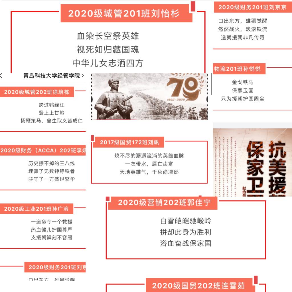 面向各年级学生开展“歌颂英雄史诗,致敬最可爱的人——纪念中国人民志愿军出国作战70周年三行诗作品征集”活动,鼓励学子秉持严谨的历史真实性原则,广参与、多形式、深层次地自学客观史实,再忆英雄本色,珍惜和平硕果,激发爱国伟志,红心敬献祖国。通过三行诗活动,引导学子以志存高远的信念,歌颂人民志愿军英勇无畏的战斗精神和“青山处处埋忠骨,何须马革裹尸还”的爱国主义精神,以红色精神为指引,凝聚中华民族强大凝聚力,勇敢担负起时代赋予的使命。