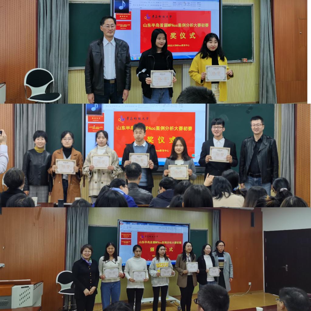 党总支书记李德成书记、副院长吕承超老师和副院长宫攀老师、MPAcc教育中心主任刘树艳教授以及财务与会计系张占贞教授为在山东半岛首届MPAcc案例大赛初赛中获奖的队伍颁奖,其中,获得一等奖的是:6的6次方队、MDZZ队;获得二等奖的有:菜的安详队、发际线总和我作队、我觉得对就队、第六感队、五小金刚队;获得三等奖的是重在参与组、非常5+1队、superego队、创新分析一级团队、帕累托效率队。
