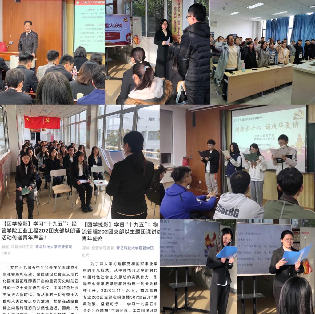 党团互联,拓宽组织育人及实践育人双重体系。院党委书记作《十九届五中全会精神解读》主题团课,启发全体青年坚持正确政治导向,自觉做到自我价值实现与国家发展同向而行。党支部开展《厚植信仰、星火滚烫》主题党课,以全会内容为根本为广大党员开展理想信念教育;开展“传承红色经典、诵读红色精神”主题党日活动,挖掘十九届五中全会蕴含的红色教育资源,发挥“红色朗读者”的活动品牌效应,构建党建育人模式一脉相承。各团支部开展“学贯十九五”系列活动,以“朗朗赤子心,诵我华夏情”主题团日活动、《十九届五中全会与我》主题团课活动、“我的使命我的团”主题演讲活动、十九届五中全会主题征文活动等,引导学生自我教育、自我管理、自我服务,全面实现十九届五中全会精神入脑入心。