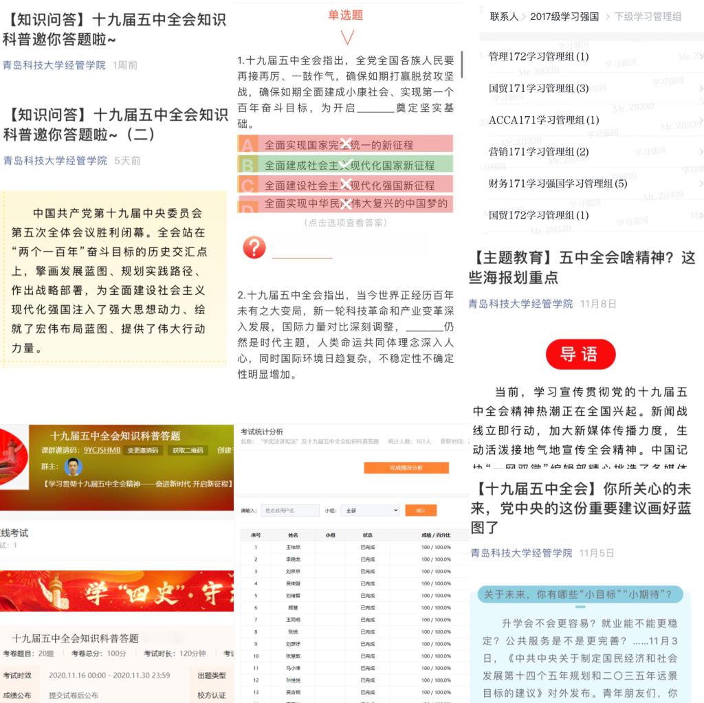 公众号平台实现“点学”,通过推送十九届五中全会“规划蓝图”,发布十九届五中全会热点要闻等系列“主题教育”,引导学生了解全会重点热点,心系发展难点、关注青年工作结合点。利用易班及公众号平台实现“精学”,组织十九届五中全会线上答题竞赛系列活动及“关键词”系列教育,引导学生聚焦全会细节,以喜闻乐见的方式,学细学精全会精神。