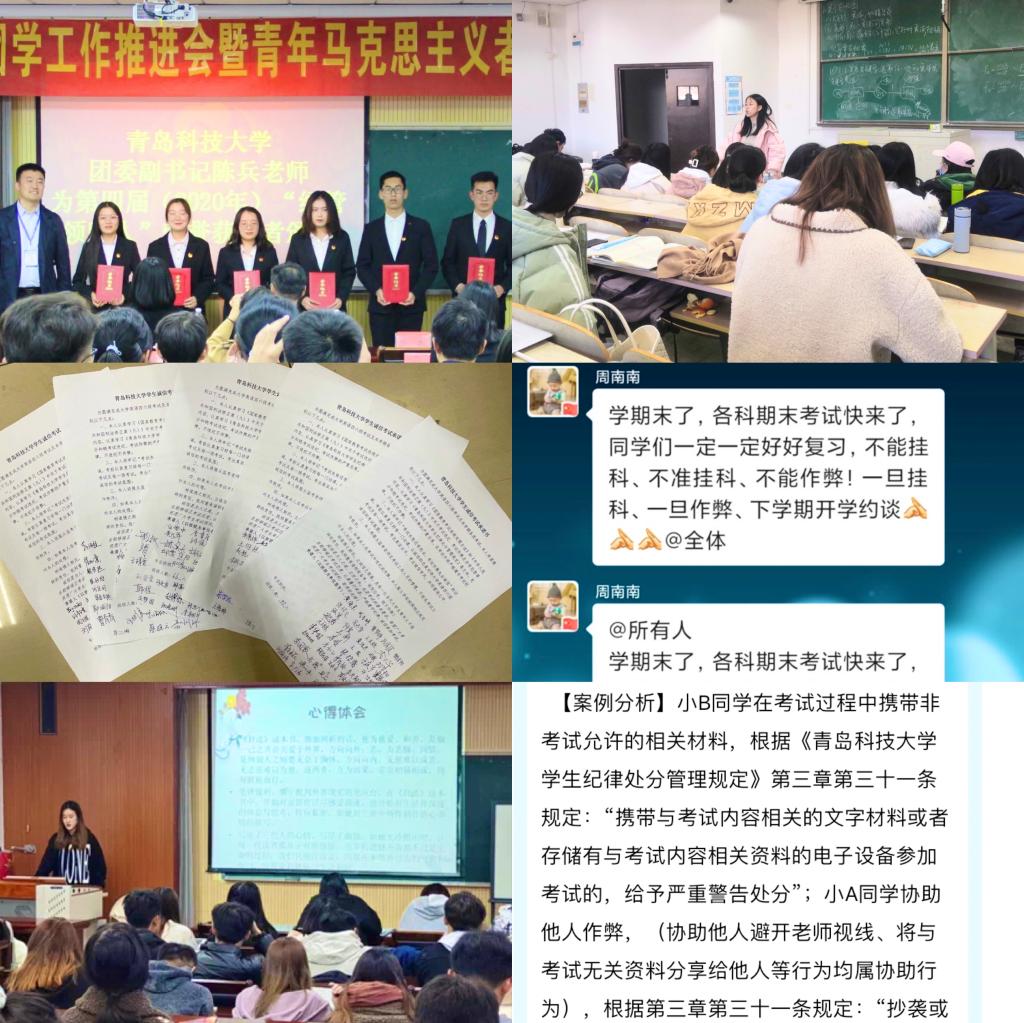 着力构建“全员、全程、全方位”的育人格局,画大学风建设“同心圆”。构建“班主任(导师)、辅导员、领跑学姐学长、党员及团学骨干”为一体的“考风考纪督查”队伍,发挥班主任(导师)指导、辅导员督导、领跑人引导、党员及团学骨干助导的工作格局,在“守好一段渠、种好责任田”的基础上推进学风建设深化实化。构建”课上课下、网内网外“的全程育人模式,巩固课堂主阵地,各年级严格制定“课堂考勤签到制度”,健全完善考核评价导向功能;启动“学风建设月”系列活动,将学风建设常态化、制度化;依托”青马工程培训班“为学业有建树的优秀学子颁奖,强化榜样教育,扩大学风引领感召力;依托“阅享经典、书香科大”读书月活动、“《习近平与大学生朋友们》阅读接力计划”等,丰富学习内容,扩宽学习成效。着力强化”“教室文化”、“宿舍文化”、“校园文化”的全方位营造工程,通过“无手机课堂”、“无违纪课堂”、“星级宿舍”评比、“党员宿舍”亮身份等举措,优化学习环境,形成乐学善思的学习氛围。