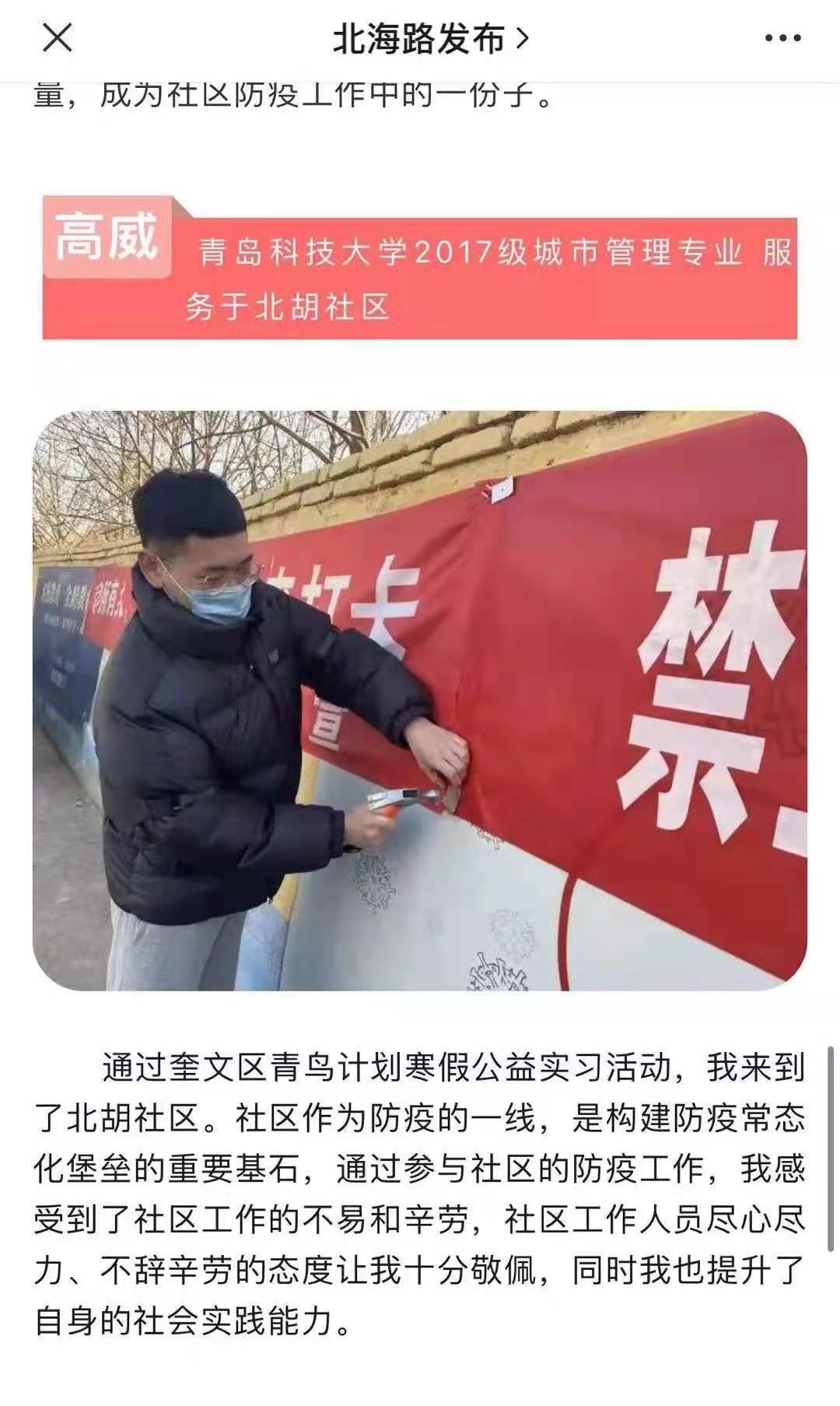 “抗疫先行,青春有为。”新一轮疫情重燃,寒假返回家乡的大学生们签下了人生的第一封请战书。他们不畏寒冷,冒着感染的风险,积极服务于当地社区,充分展现了青科学子不畏困难,无私奉献的宝贵精神。多日的志愿服务,也让他们有了万千感慨。