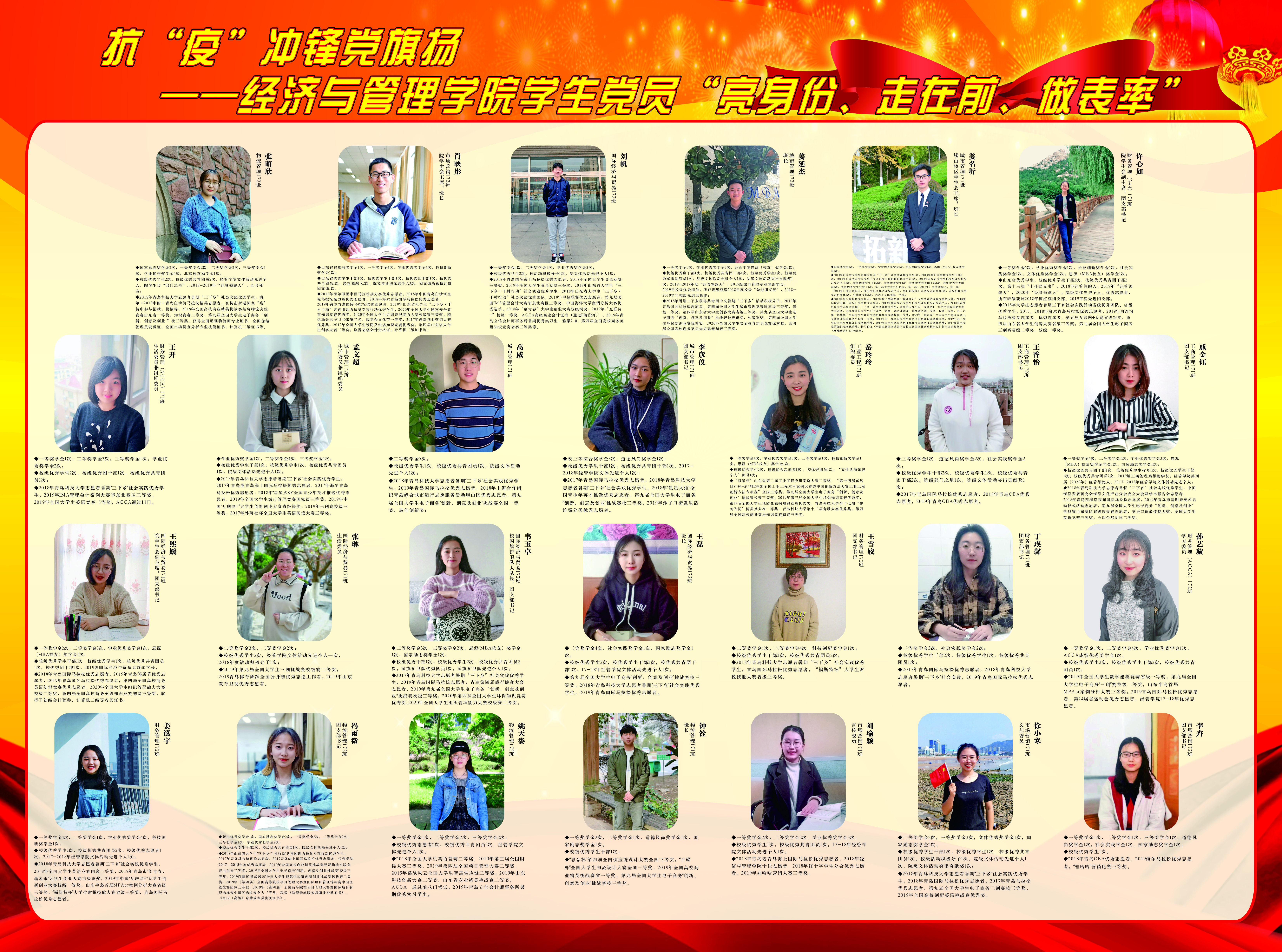 社会实践开展情况及活动成效,累计达200余篇。其中1个项目获评2020年全国大学生“趁年轻,去基层”千校千项“基础新画卷”,1人获评全国暑期社会实践百强团队优秀指导老师,1人获评山东省优秀指导教师、5人获评山东省优秀学生;“花饽饽”助力乡村振兴公益项目成功入围首届青岛市新时代文明实践志愿服务项目创益大赛50强;疫情期间,经管学子纷纷行动起来,有315名学生投身志愿,103名学生捐款捐物,620名学生通过网络传递正能量;积极响应“希望小屋”建设工作,捐款15800元,助力精准扶贫,用行动践行了社会主义核心价值观。