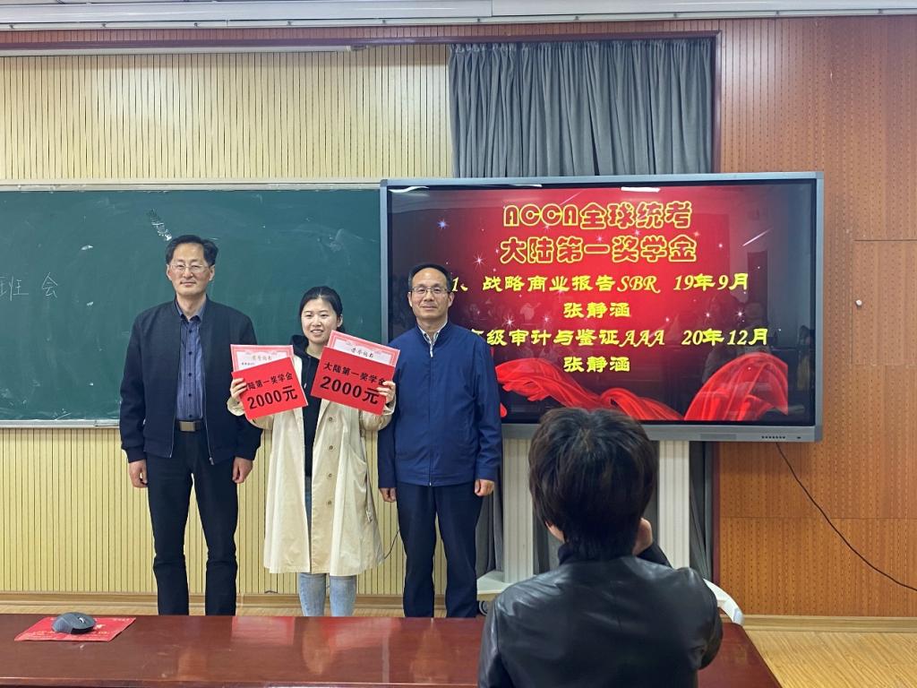 党委书记李德成、副院长宫攀为获得单科奖学金的学生颁发奖学金和荣誉证书;院长李勋来为两次获得大陆第一的优秀学生张静涵颁奖。张静涵目前已经通过ACCA全部科目,且所有科目均为一次性通过,获得了战略商业报告(SBR)2019年9月全球统考和高级审计与鉴证(AAA)2020年12月考季全球统考两个科目状元。颁奖仪式结束后,她为同学们做了经验分享,良好的学习态度和学习习惯是取得优异成绩的制胜法宝。