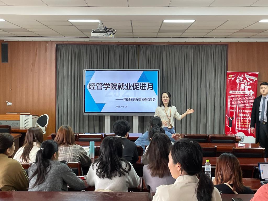 “重引领、重帮扶、重实效”就业促进月活动方案的总体要求,4月28日上午,市场营销系在经管楼504室举办专场招聘会,营销系副主任张艳青老师出席活动,系2017级、2018级全体同学参加活动。
