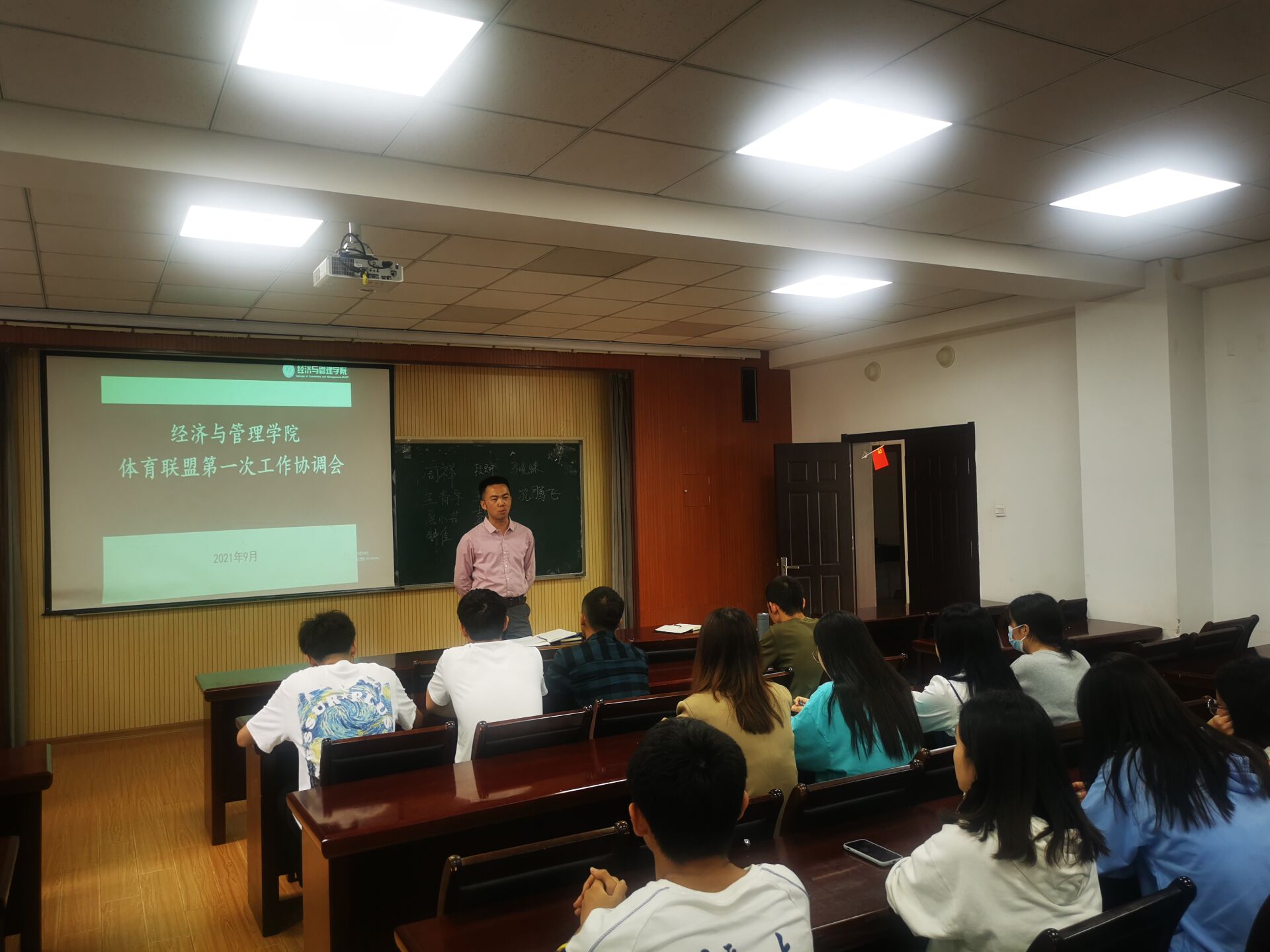 体育联盟第一次工作协调会议在经管楼419会议室召开,联盟指导老师高守朋,学生会体育部全体成员、各协会负责人参与会议。