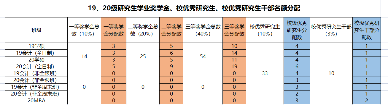 )、学业奖学金一等、二等、三等各14个、25个、54个,校优秀研究生33个、校优秀研究生干部10个,现将研究生学业奖学金、校优秀研究生、校优秀研究生干部名额分配如下: