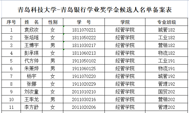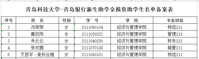 《关于评审2021年度青岛银行奖助学金的通知》的要求,经个人申请、材料审核,结合前期奖助学金获得情况,现对青岛银行奖助学金获得者予以公示,公示期3个工作日,公示时间2022年4月25日-2022年4月27日。