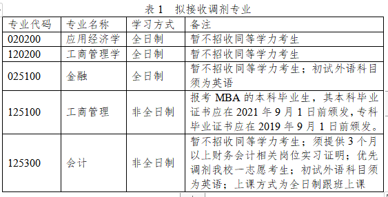 接收调剂专业予以公布(见表1),供考生参考。