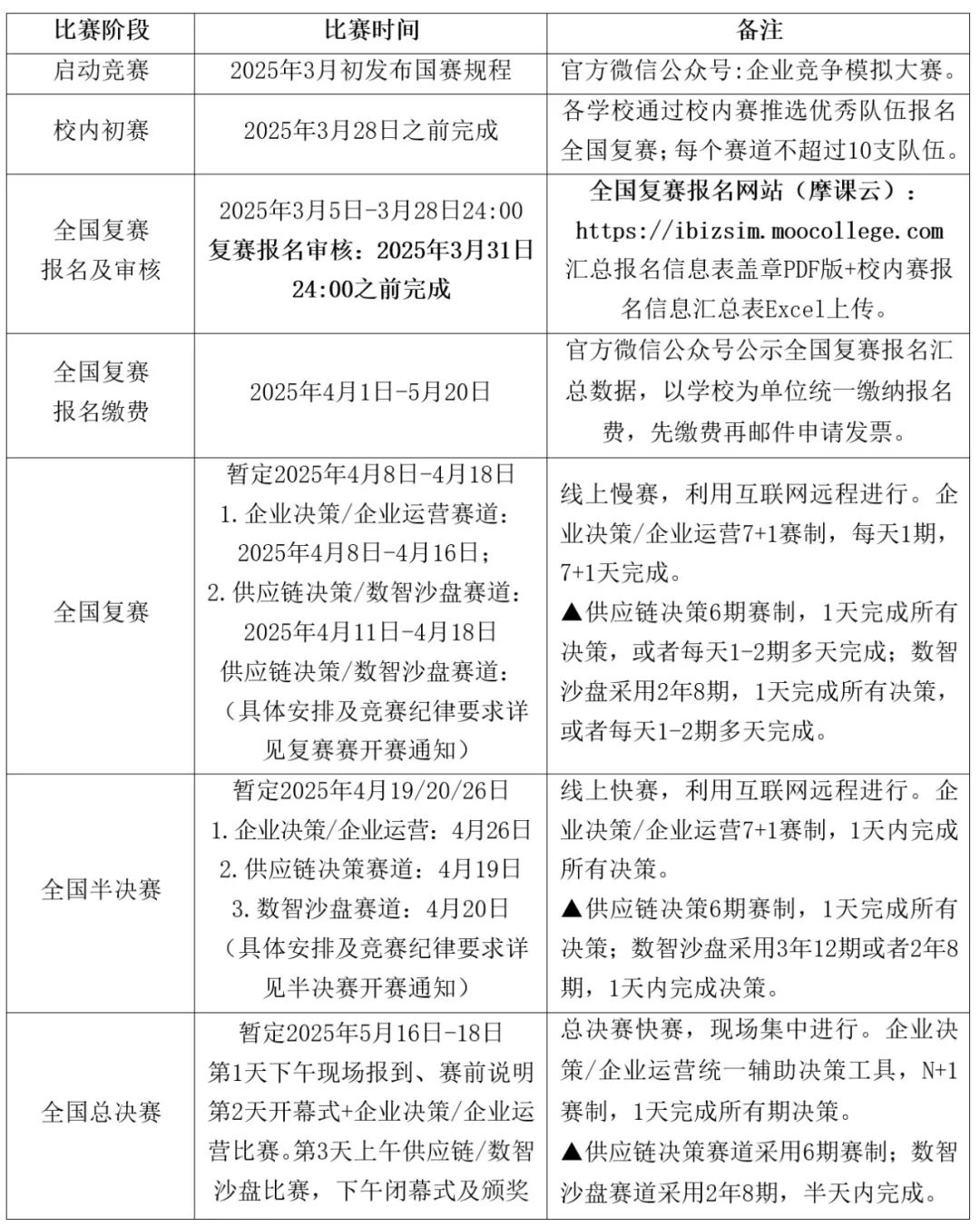 2025年全国企业竞争模拟大赛分校内初赛、全国复赛、全国半决赛、全国总决赛共四个阶段,具体赛程安排如下: