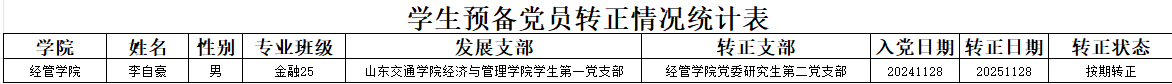 研究生第二党支部于2025年12月2日召开预备党员转正大会讨论李自豪同志的转正问题,同意上述同志按期转为中共正式党员,现将其情况予以公示。公示期为2025年12月8日至2025年12月12日。如有异议,请于公示期内到7mmtv