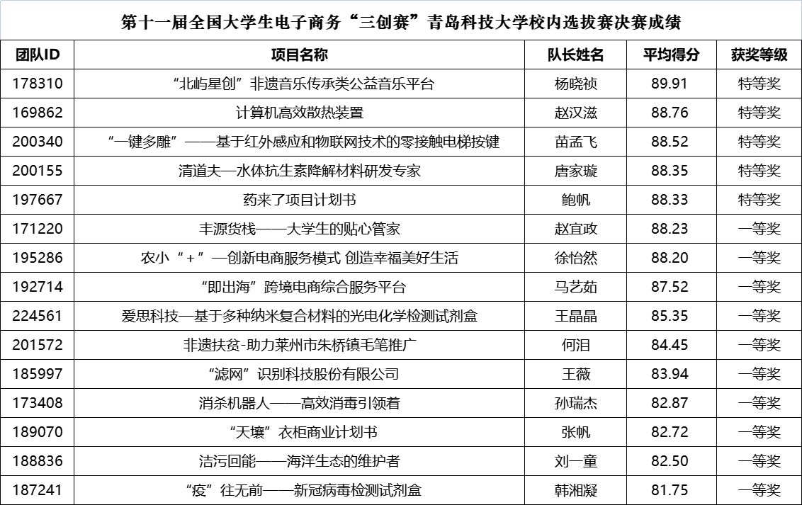 于2021年5月9日举办了校内选拔赛现场决赛。现场决赛中专家评委严格按照大赛评审流程和评分细则,对参赛项目作品进行了评审评分,根据评审结果,现将决赛成绩公布如下: