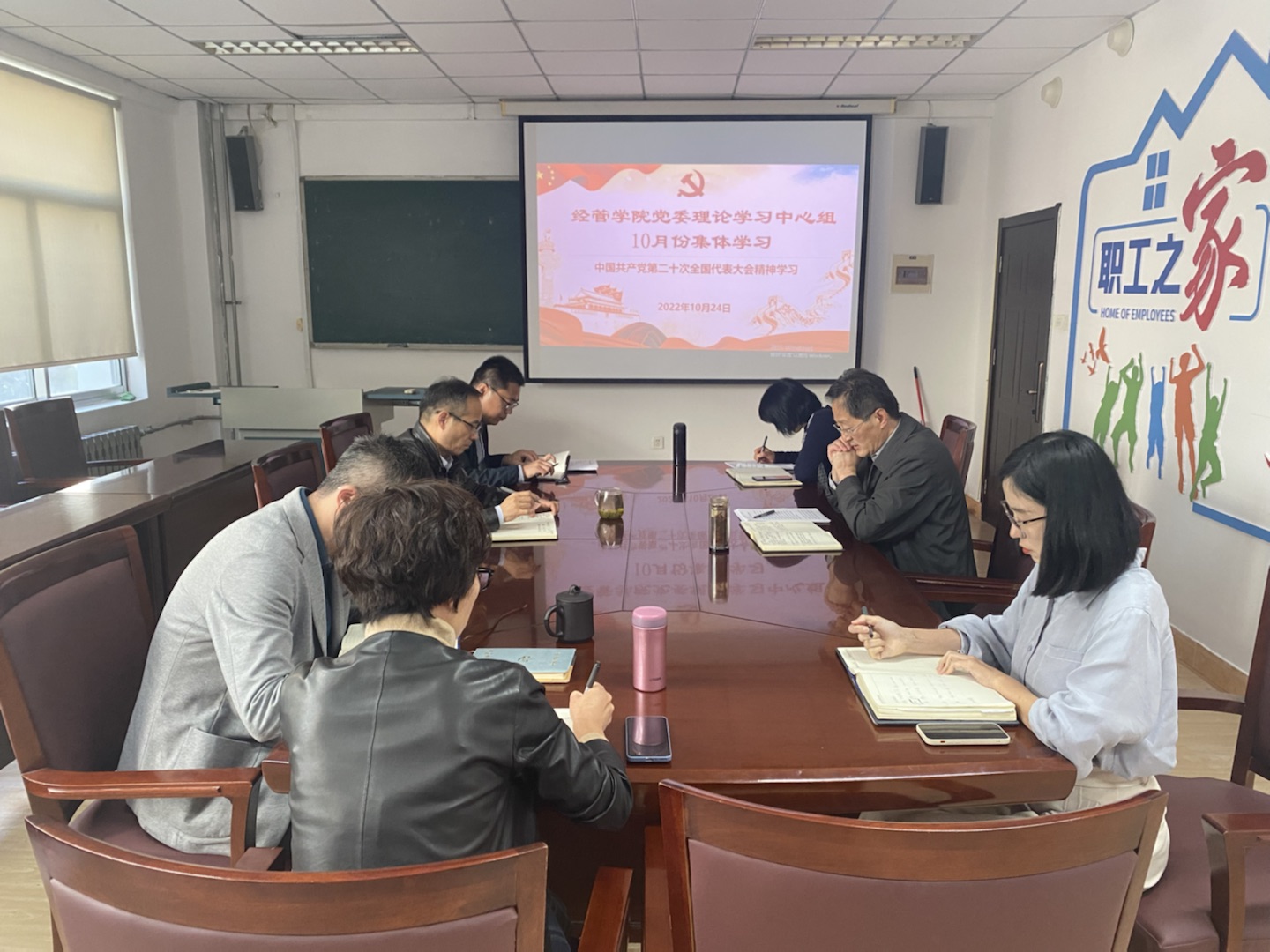 党委理论学习中心组于经管楼415会议室开展集体学习,理论学习中心组全体成员参与学习,党委书记李德成主持学习。