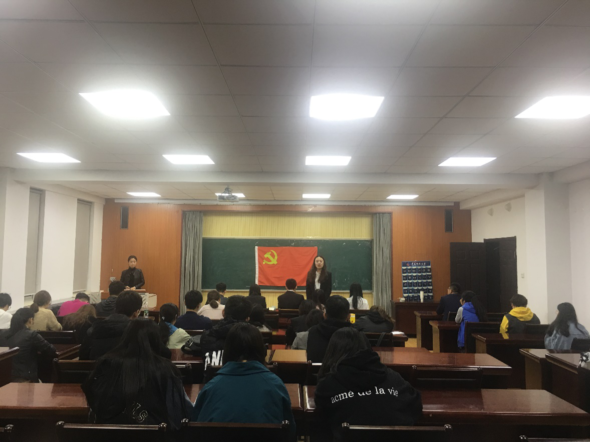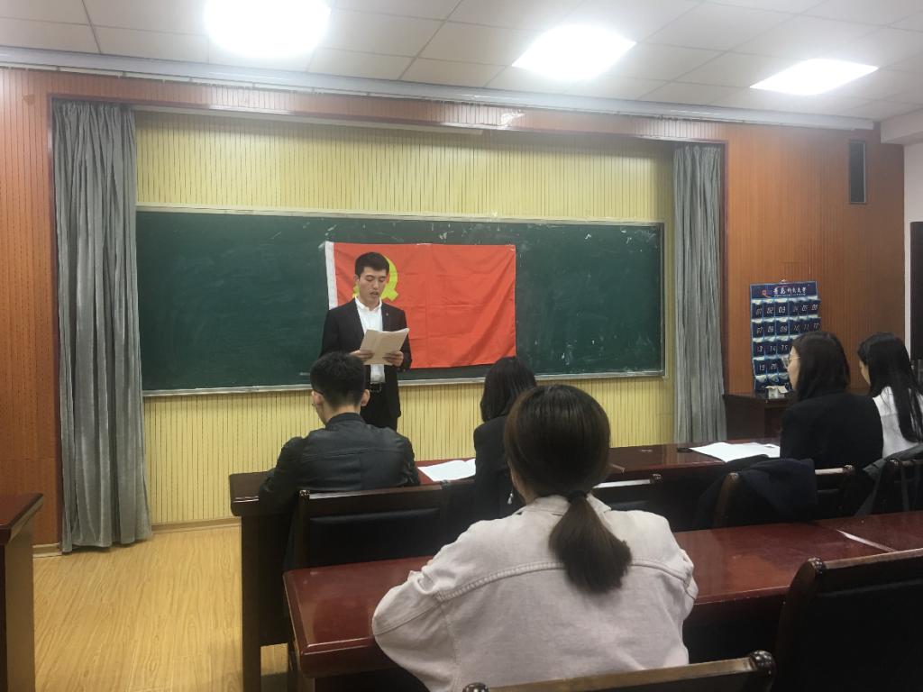大会伊始,与会人员全体起立齐唱《国际歌》,申请入党的发展对象范琦琪、赵得志、李金宝、牛晓童、陈蕾等五位同志依次上台宣读入党志愿书,以及汇报自己入党动机和对党的认识等问题,每位同志的两名入党介绍人从学习、工作、思想等方面介绍发展对象的基本情况并发表意见,随后支部委员会介绍申请人的政治审查情况,与会人员开展积极讨论,对发展对象提出不足和改进建议。最后,支部大会作出无记名投票并宣读决议,同意接收范琦琪等五位同志为中共预备党员,并将向上级党委申报进行审批。